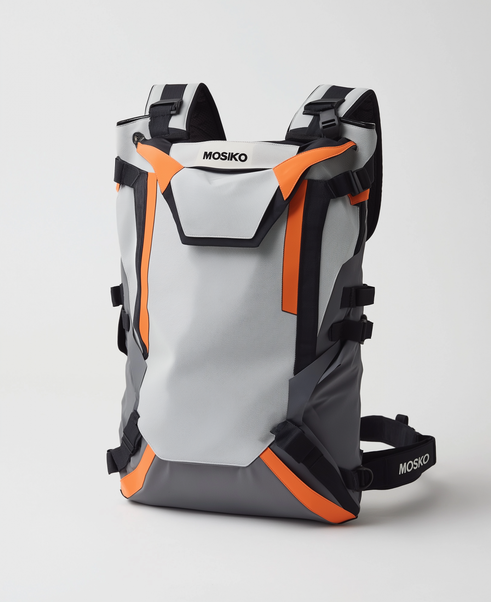 The image shows a sleek and modern motorcycle backpack in gray and orange, highlighted against a clean white background. Its black accents add a touch of sophistication, making it visually striking.