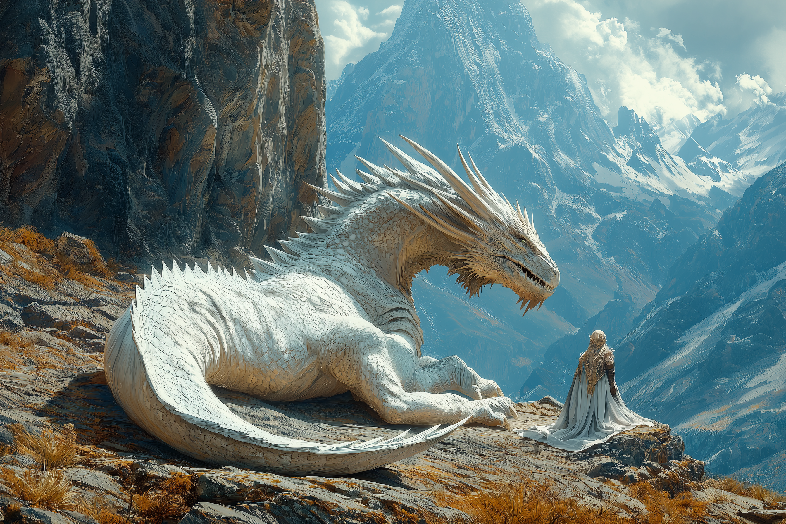 A majestic yet exhausted dragon rests on a rocky outcrop, surrounded by rugged mountains under a dim twilight sky. Next to the dragon, a fully armored lady stands, creating an atmosphere of fantasy and adventure.