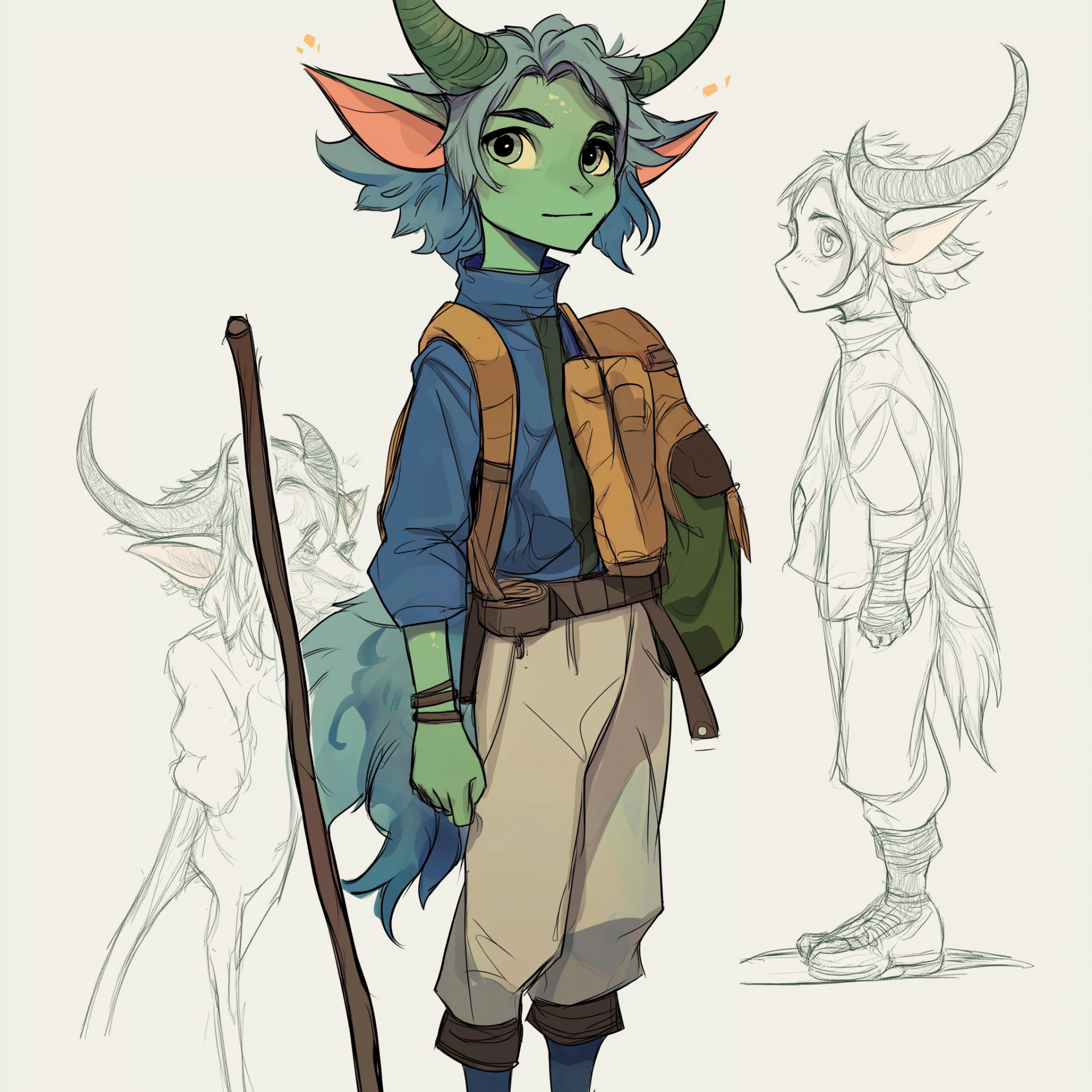The illustration features a fantastical character with horns and a kind gaze. This vibrant character is depicted in various movements, dressed in shades of blue and green, carrying a stick and a backpack.