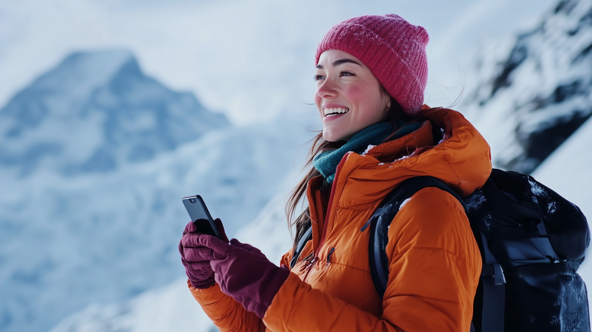 A joyful red-haired woman smiles while looking at her phone at the summit of Mount Everest. Dressed in orange with purple details, she appears in a heroic, cinematic framing that emphasizes the breathtaking landscape around her.