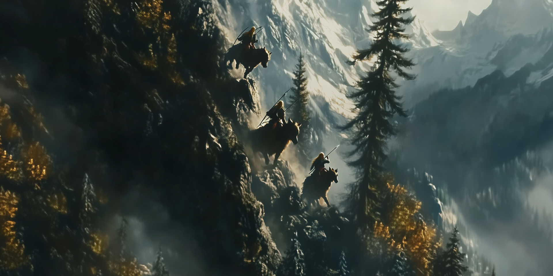 This illustration depicts a group of elves riding majestic wolves through rugged mountain terrain. The scene is filled with vibrant pine trees, showcasing a wild yet harmonious atmosphere as they embark on their hunt.
