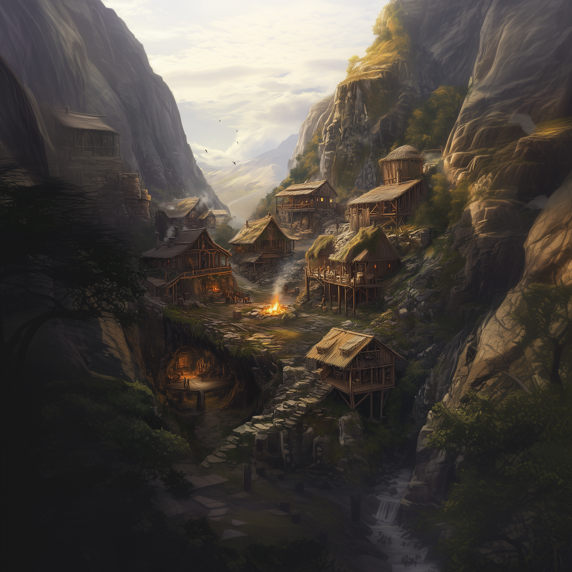 This image captures a picturesque mountain village nestled on a rocky plateau. Each cabin has its own unique design, blending rustic charm with the surrounding natural beauty.