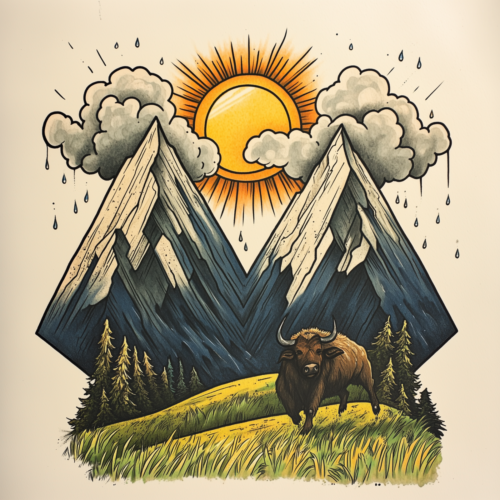 This tattoo design features two mountains forming the letter 'M', with a bright sun and rain clouds situated between them. In the foreground, a majestic buffalo is depicted running on lush grass, all rendered in vibrant colors in a hyper-realistic style.