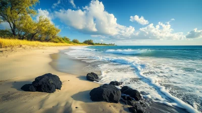 The image depicts a breathtaking mountain landscape under a clear blue sky. Lush greenery surrounds the peaks, creating a tranquil and serene atmosphere.
