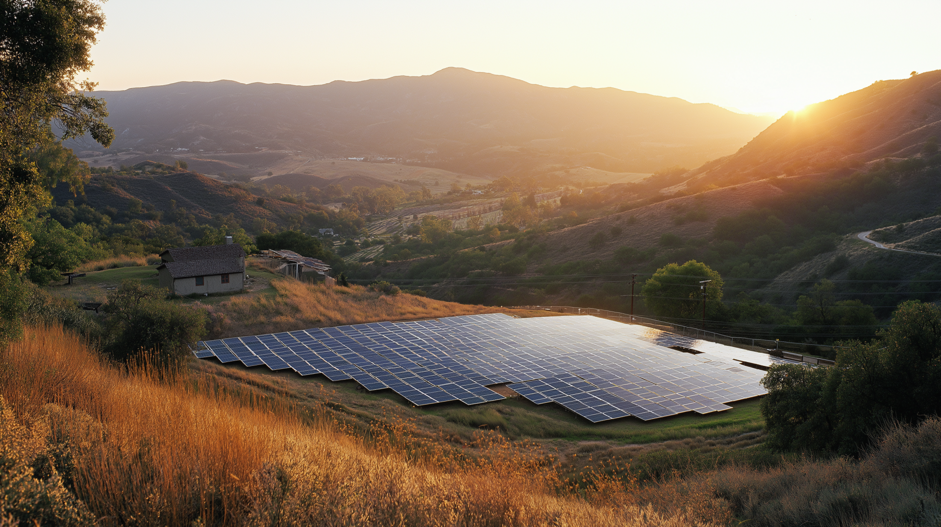 This realistic photo captures a breathtaking view from the top of a mountain overlooking a valley at sunrise. The warm orange hues of the sun gently illuminate the landscape, dotted with farmhouses and oak trees, showcasing a serene rural scene.