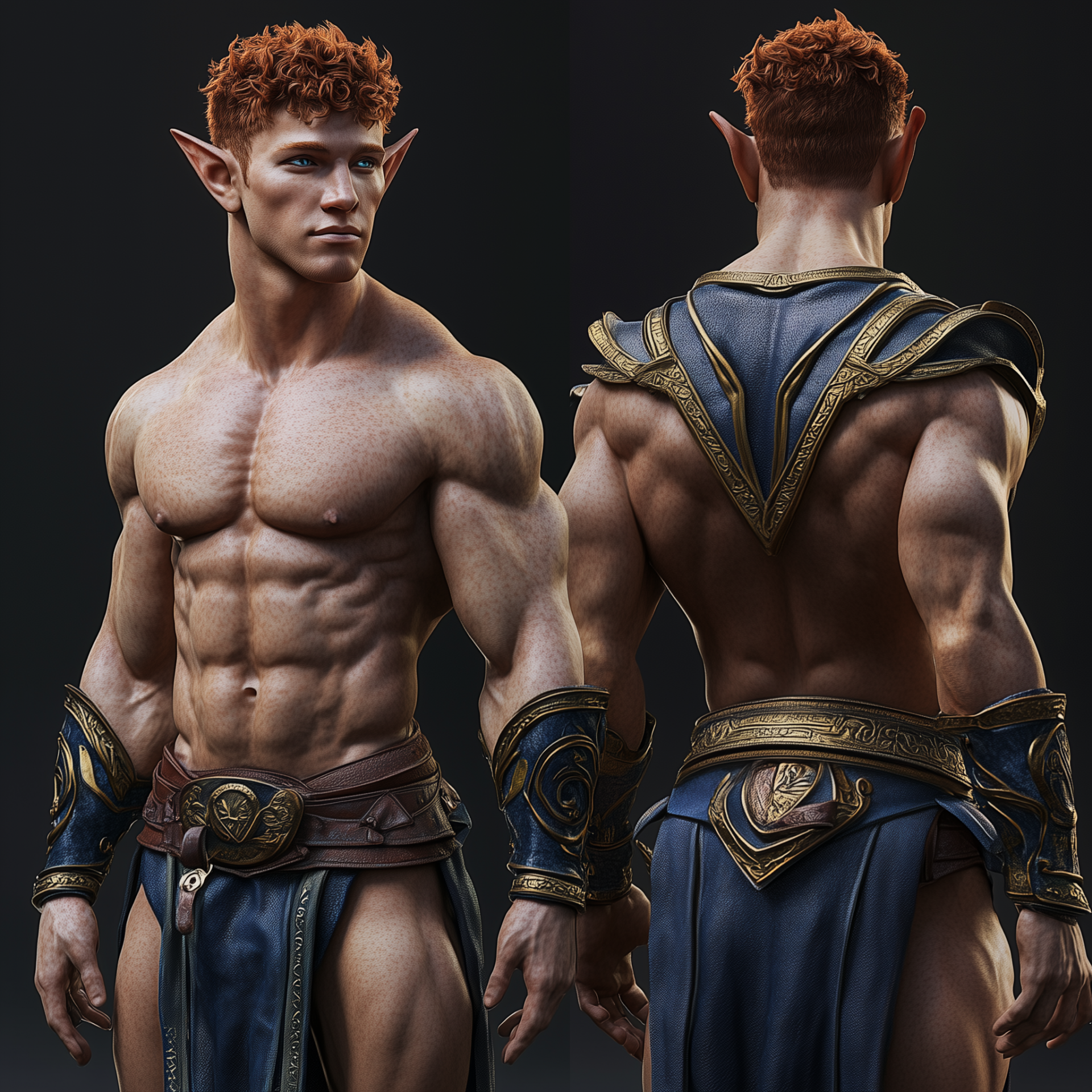 This image showcases a highly detailed 3D rendering of a powerful muscular elf with striking features. The elf is depicted in a full body shot, adorned in dark blue Roman centurion armor with gold accents, exuding a commanding presence.