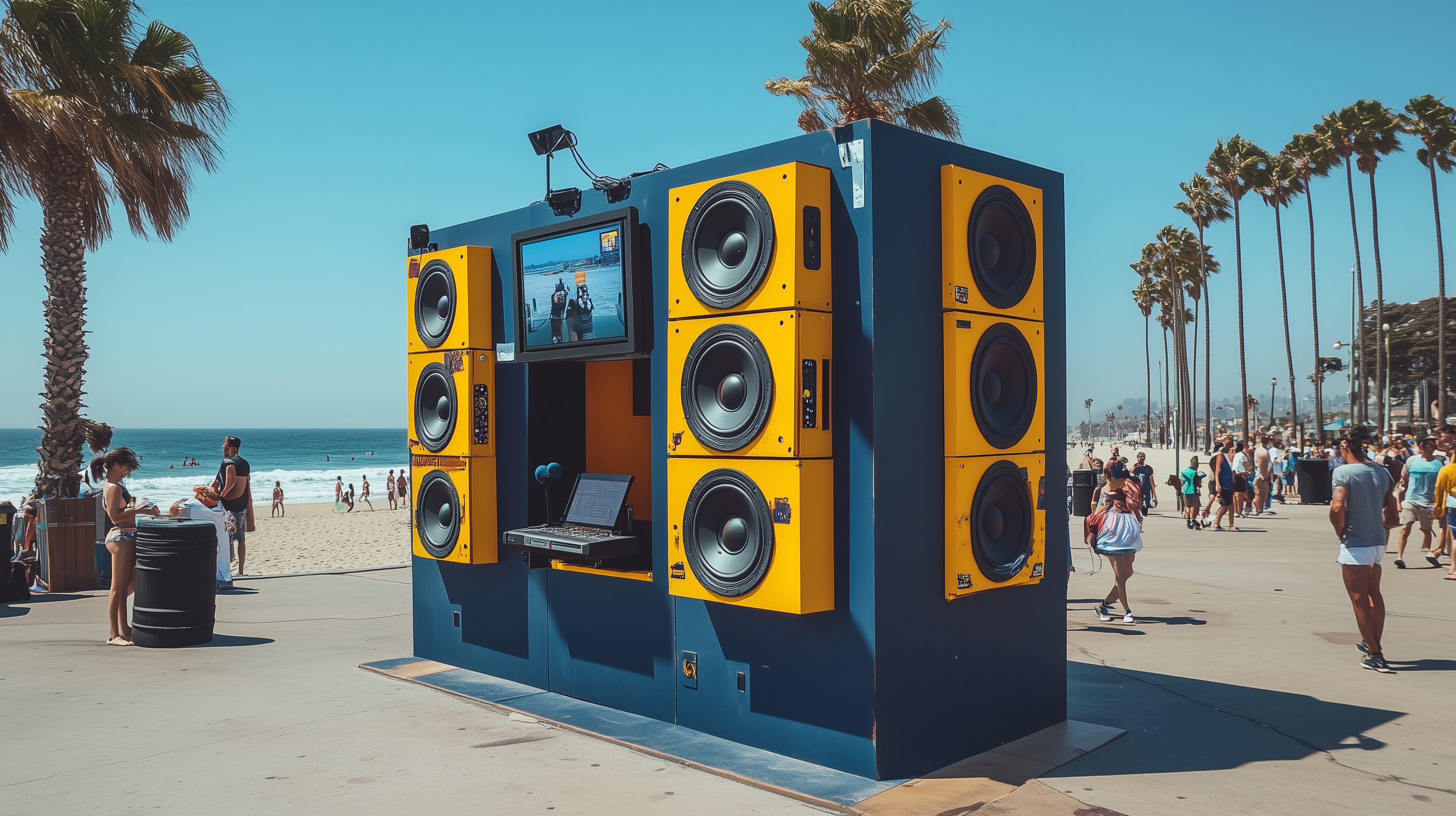 This image features a striking sound system speaker installation set in a vibrant booth at Muscle Beach. The dark blue and yellow colors stand out amidst the lively atmosphere, inviting onlookers to engage with the playful karaoke setup.