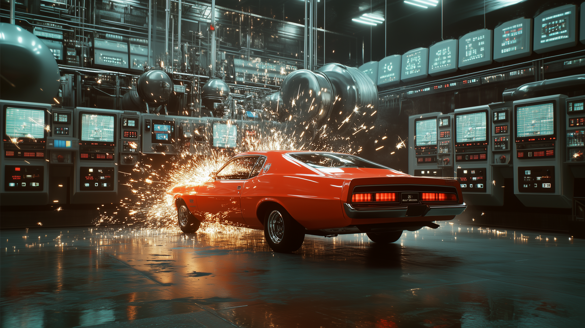 A striking image of a red muscle car crashing into a massive control room wall, creating chaos. The scene is filled with flying glass and sparks, set against a dramatic factory backdrop with numerous illuminated screens and tanks.