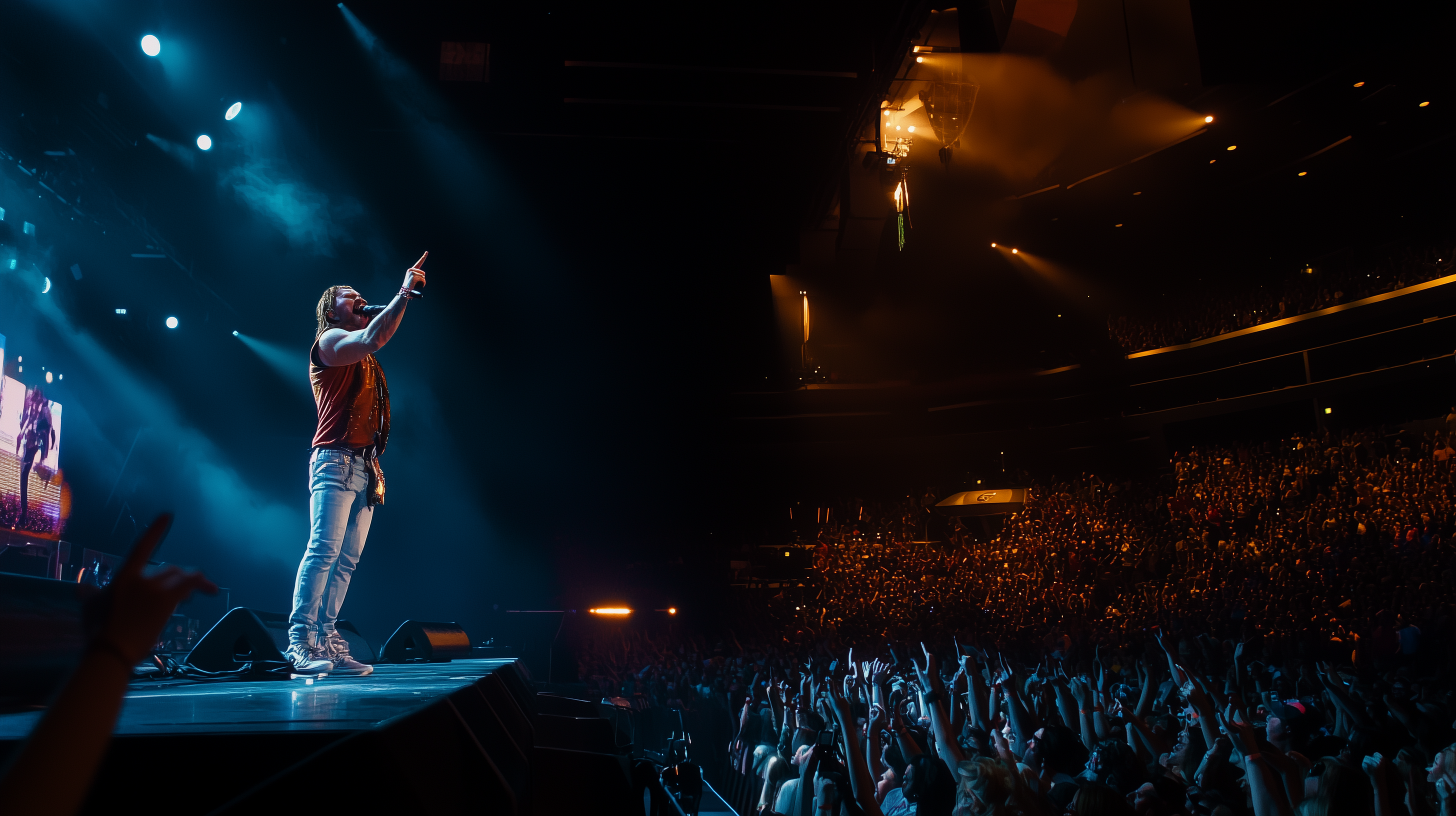 The image captures a dynamic live performance with vibrant lighting illuminating the stage. Fans can be seen cheering and enjoying the electrifying atmosphere created by the artist.
