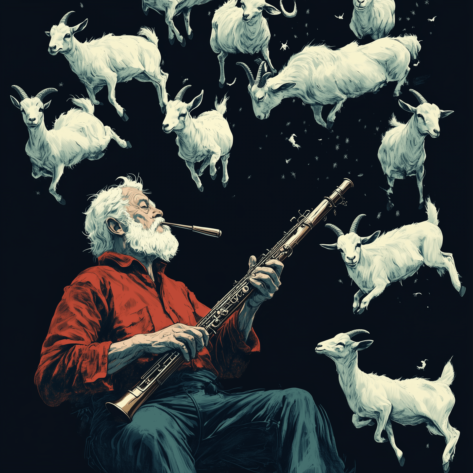 This illustration depicts an old man joyfully playing an oboe surrounded by floating goats. The artwork features a colorful and whimsical style, with a sense of lightness and low gravity enhancing the enchanting scene.