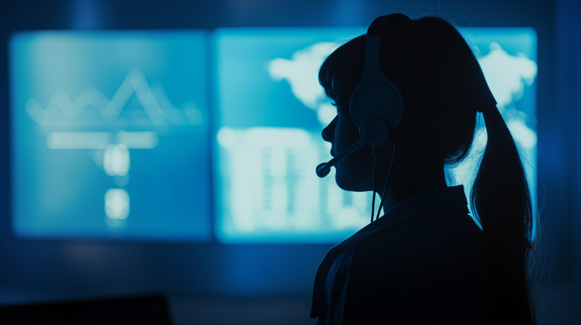 The image features a striking silhouette of a woman wearing a headset with a microphone. She is positioned in front of a glowing white dashboard on a dark blue screen, creating a captivating contrast against the deep shadows.