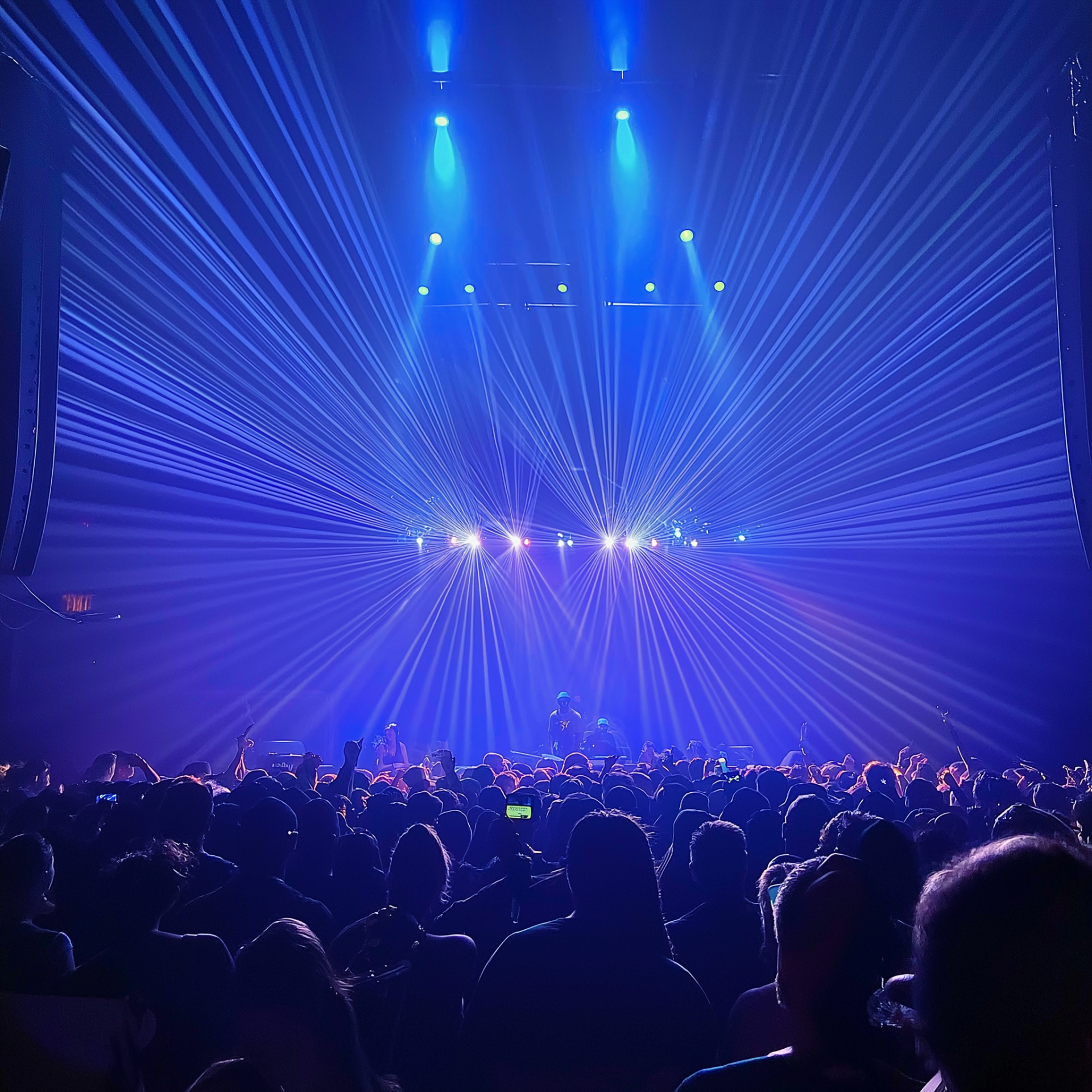 The image captures the electrifying atmosphere of a packed live show, viewed from behind the crowd. Bright blue neon lights illuminate the stage, creating a lively and energetic vibe as the audience enjoys the performance.