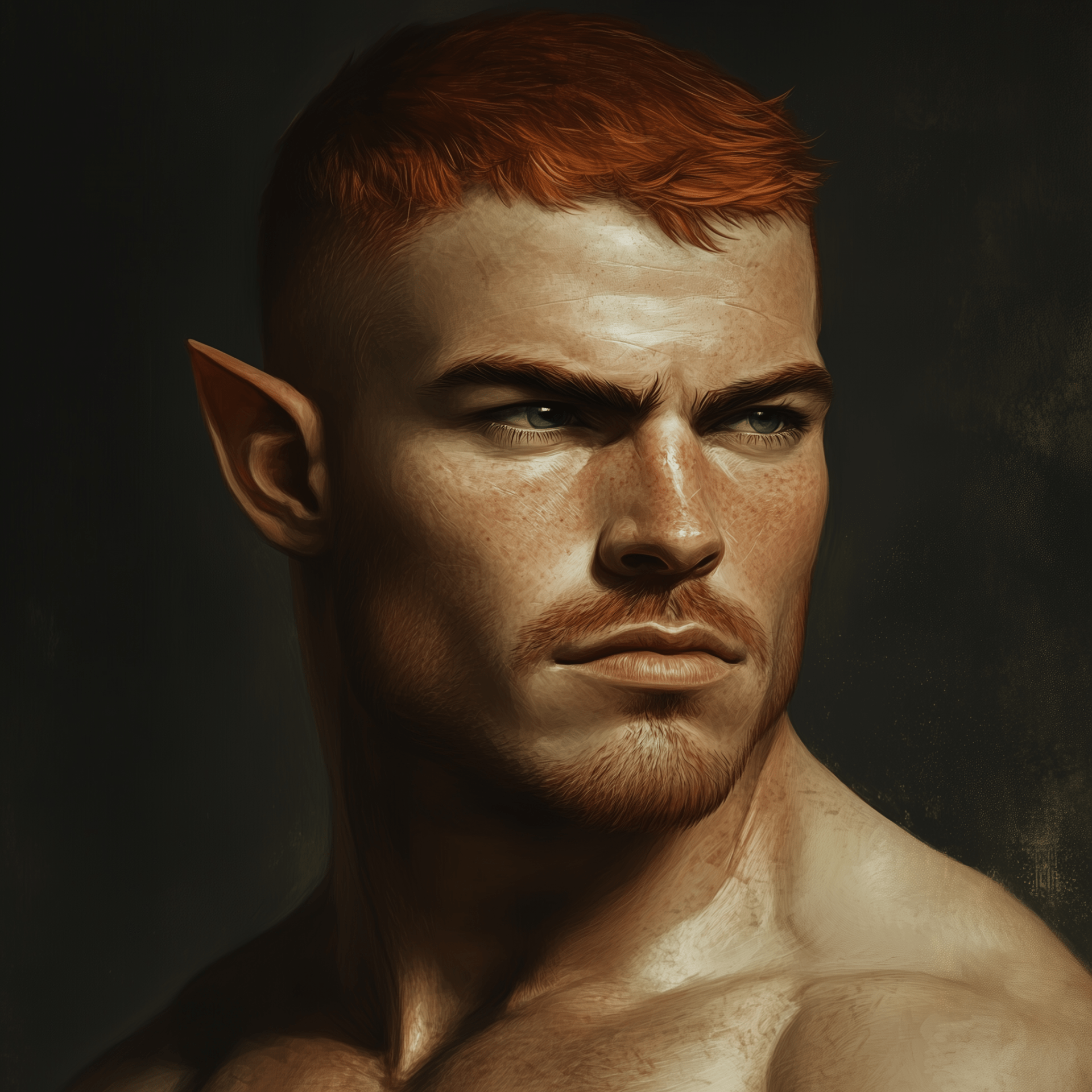 The portrait showcases a striking half orc powerlifter with a muscular build and masculine features. He has short, vibrant red hair and piercing silver eyes, exuding confidence and strength.