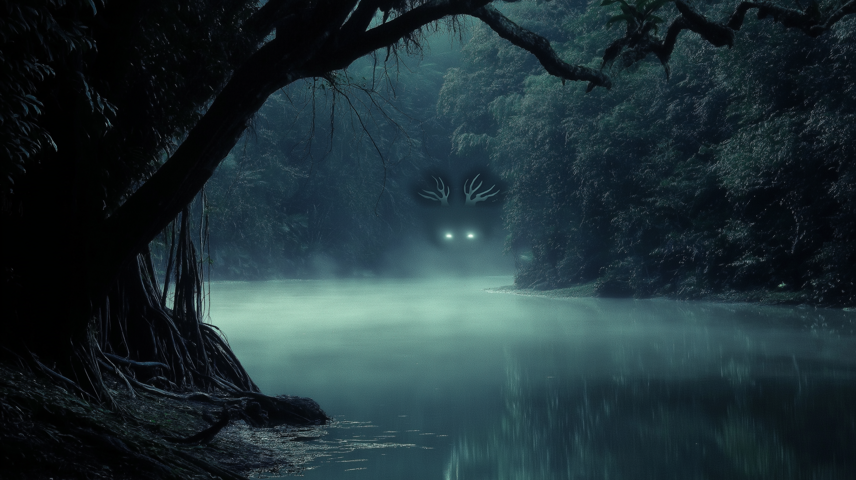 The image captures a mysterious jungle shoreline illuminated by faint moonlight. Thick vines and gnarled roots create an eerie, enchanting feeling as glowing eyes emerge from the still lake's surface.