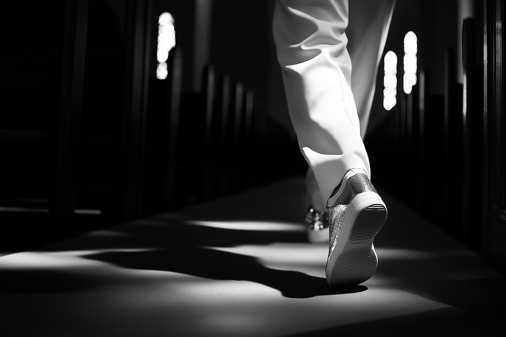 This image captures a side profile shot of an individual in a white track suit, walking down a dimly lit church aisle at night. The black and white tones, combined with sparse moonlight, create a mysterious and cinematic atmosphere reminiscent of classic suspense films.
