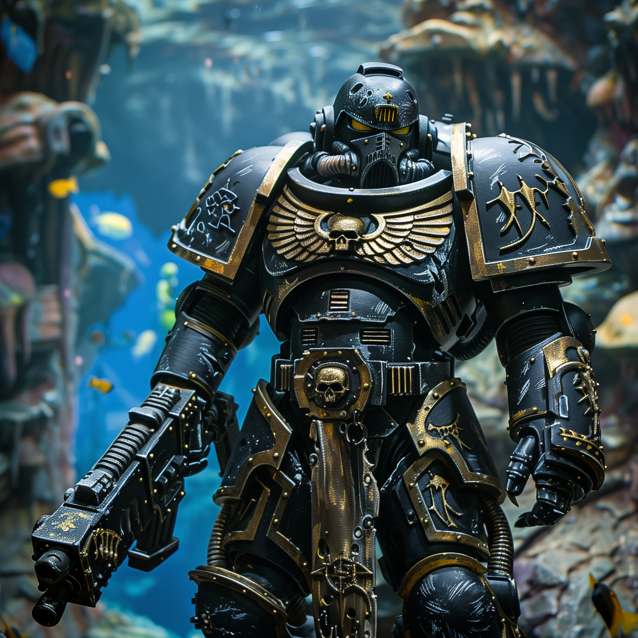A dark and menacing figure adorned in futuristic armor, standing in a tranquil setting surrounded by aquatic life. The contrast between the eerie presence of the figure and the peacefulness of the aquarium creates a sense of mystery and tension.