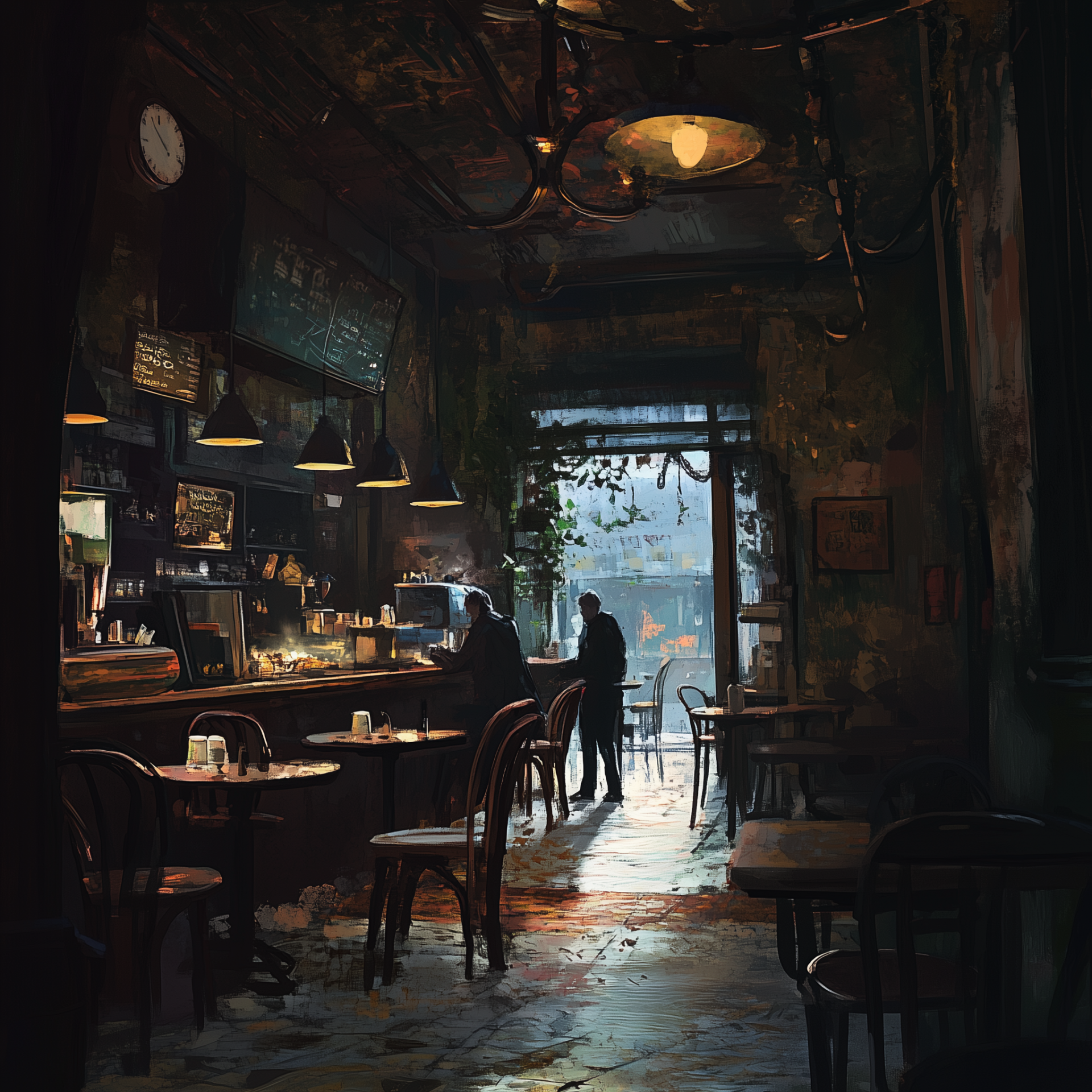 The image captures a vibrant cafe scene bustling with activity, where various patrons engage in conversations and share stories. Behind the lively atmosphere, a sense of mystery lingers, hinting at hidden secrets waiting to be uncovered.