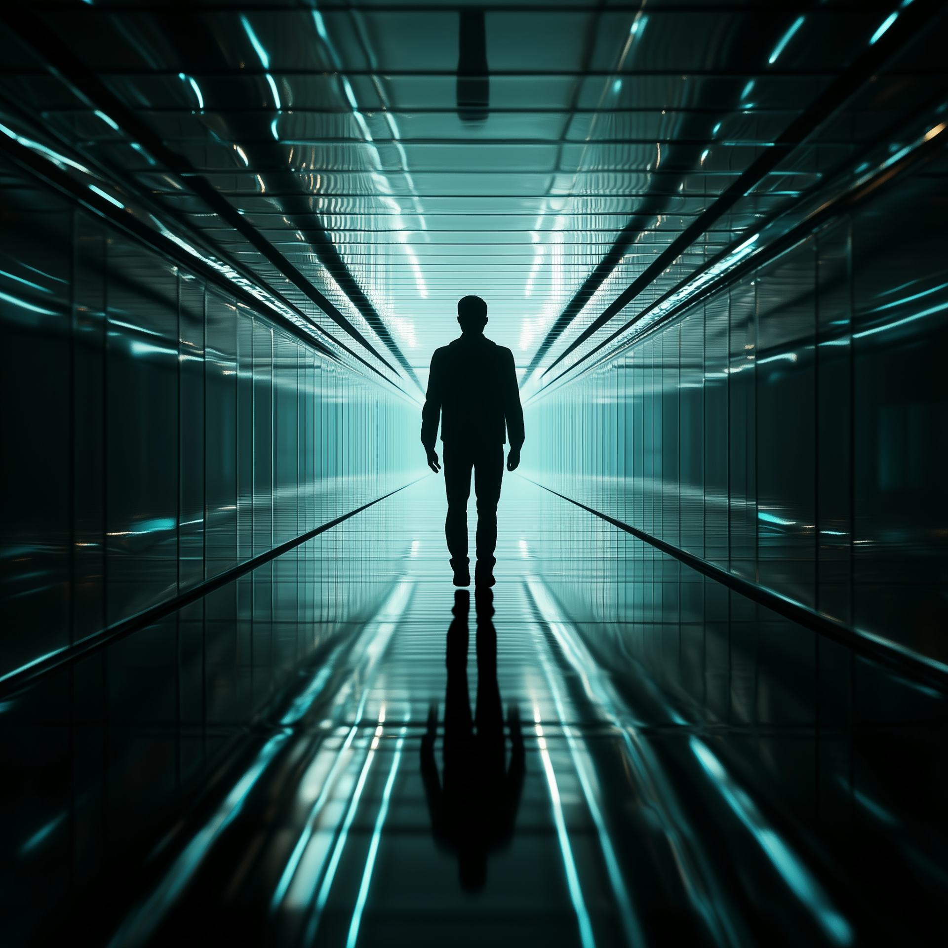 The image features a dramatic silhouette of a man standing in a seemingly endless corridor, creating a sense of mystery and intrigue. The lighting casts long shadows, enhancing the atmosphere and depth of the scene.