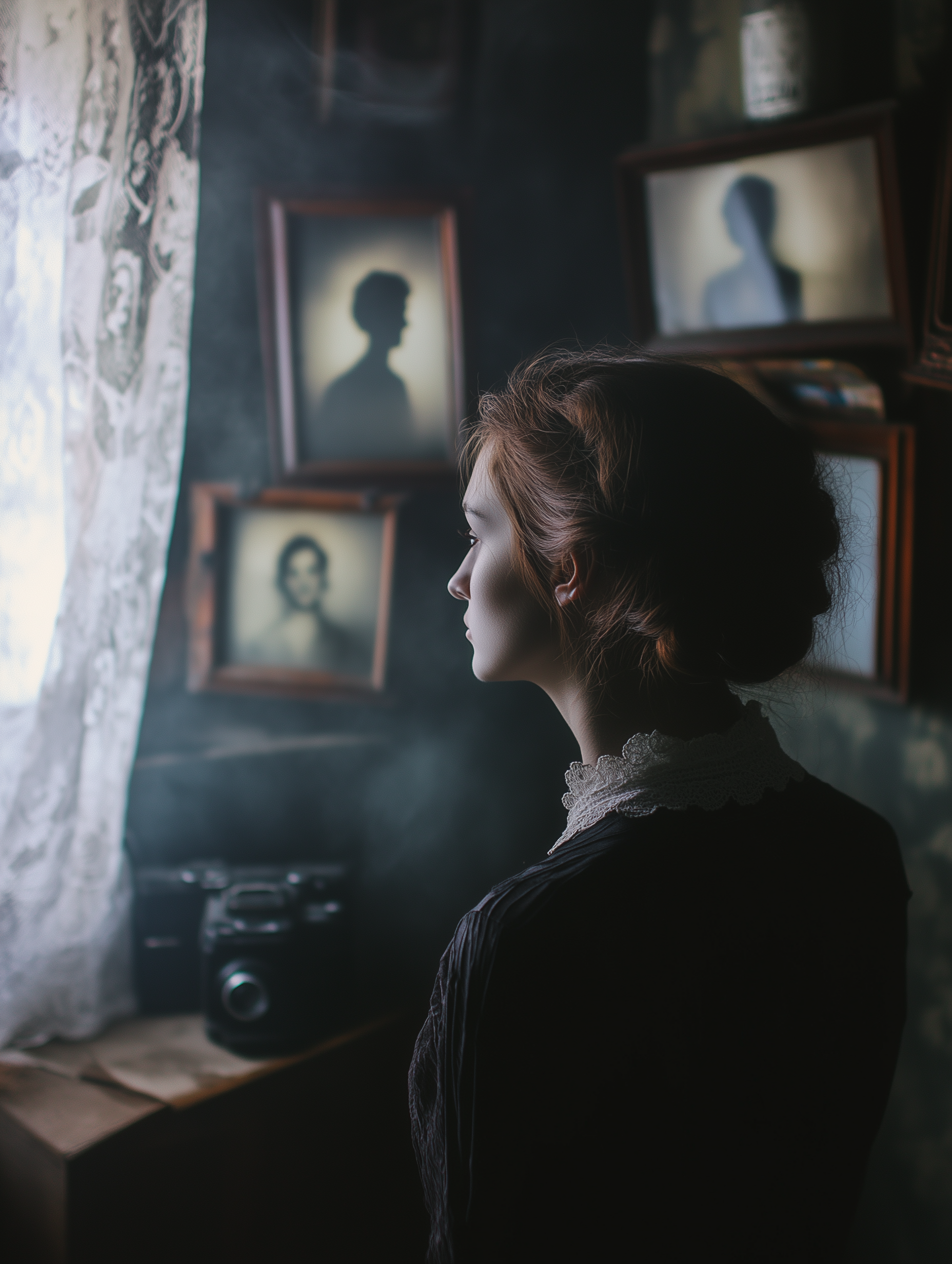 This image captures a woman in a moody, semi-lit environment, reminiscent of classic Soviet photography. The atmospheric composition evokes a sense of mystery and nostalgia, drawing viewers into a different era.