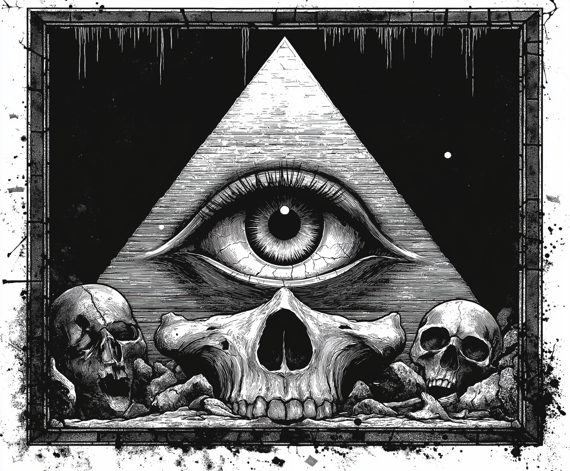 This black and white illustration features a blend of mystical symbols including the Eye of Horus and the Eye of Providence. The composition conveys a sense of intrigue, combining elements of spirituality and conspiracy in a technical style.