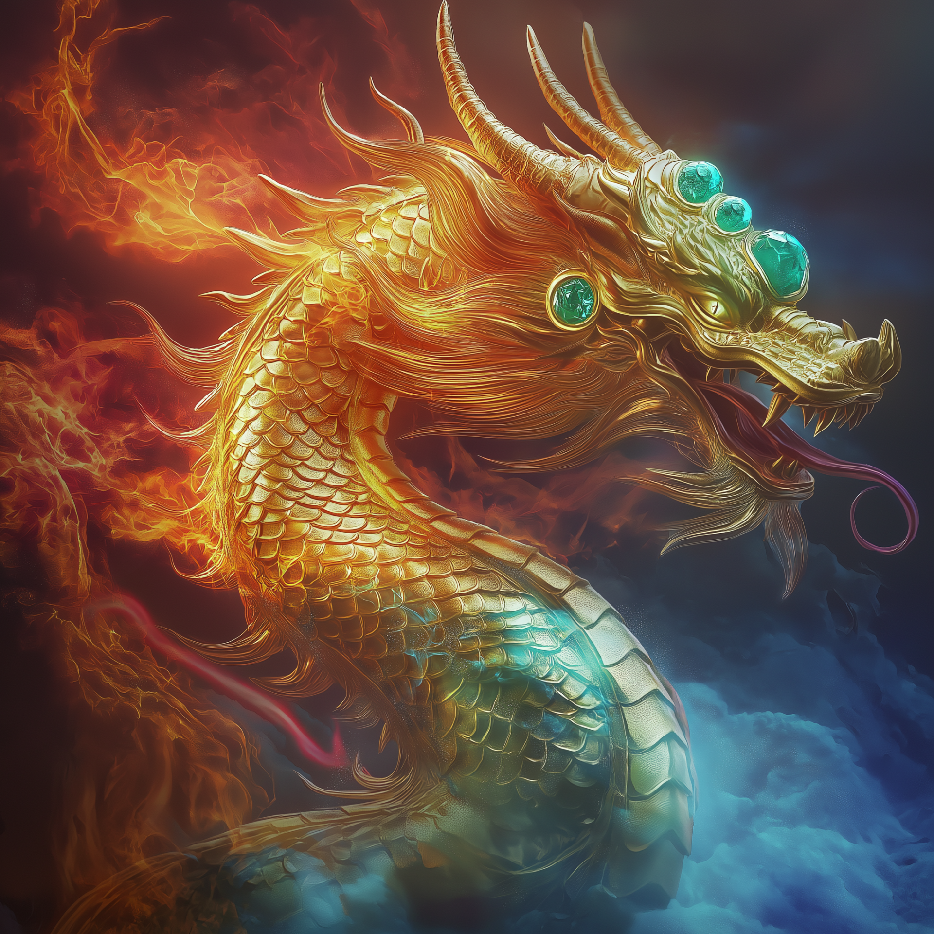 The image depicts a majestic dragon with shimmering gold and silver scales, radiating an aura of power. Its body is adorned with intricate green gems, and it exudes flames while surrounded by swirling ice mists.
