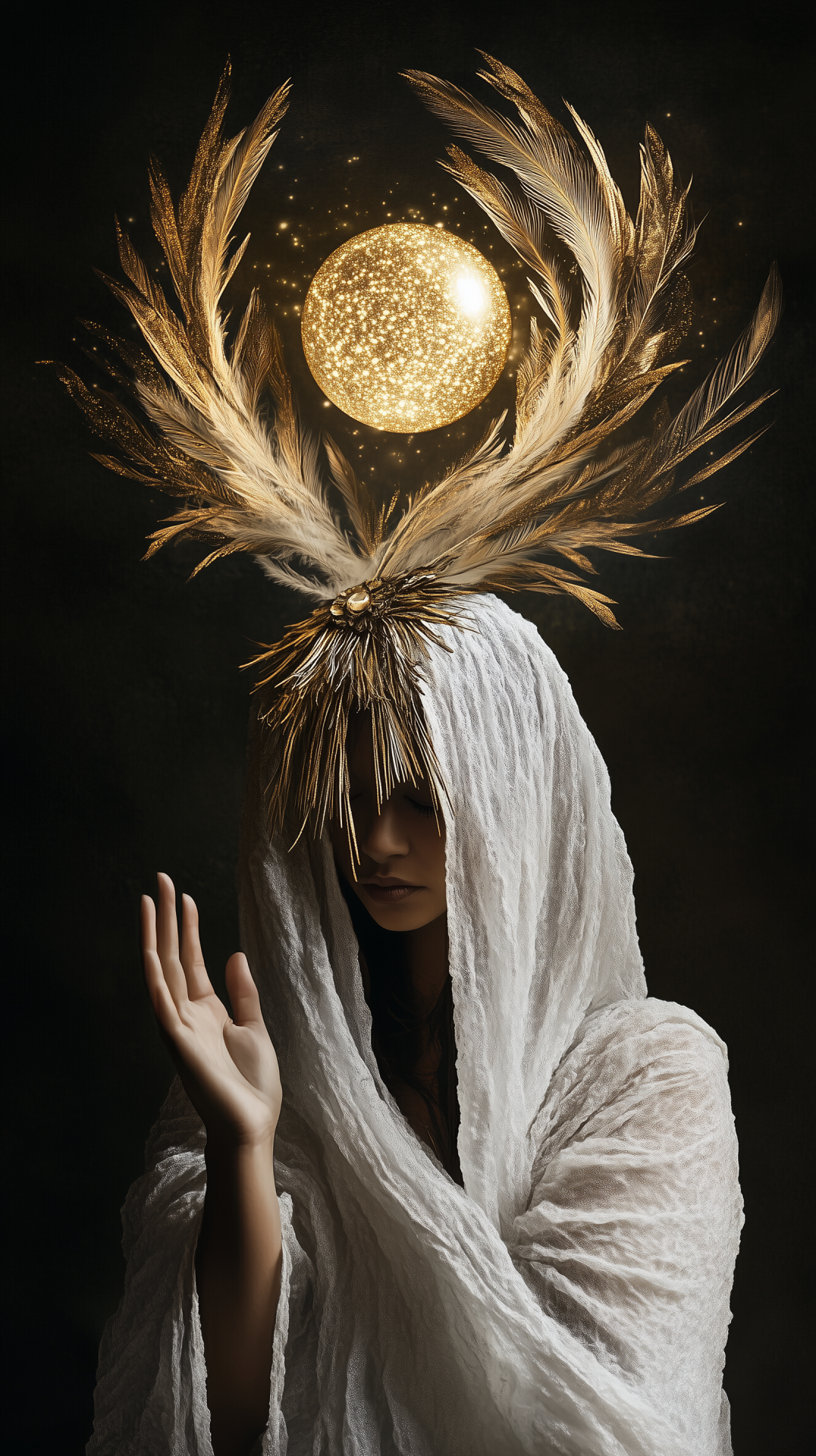 The image captures an indigenous latina woman adorned in shimmering black and white attire with a soft veil that adds an air of mystery. Floating golden feathers and an ethereal orb enhance the sense of beauty and tranquility against a neutral background.