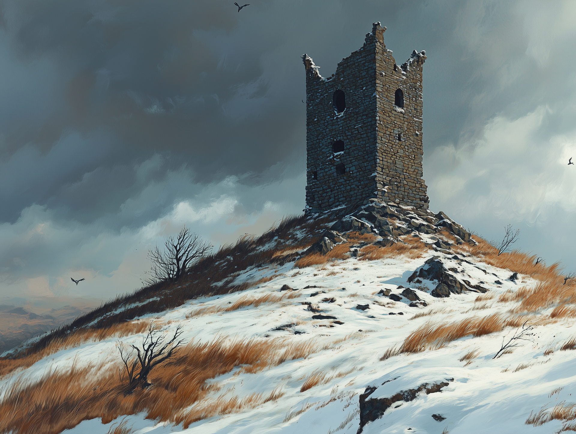 The illustration depicts a crumbling medieval tower standing tall on a desolate hill, surrounded by a winter landscape. Overcast skies create a somber atmosphere, enhancing the mystical quality of the scene.