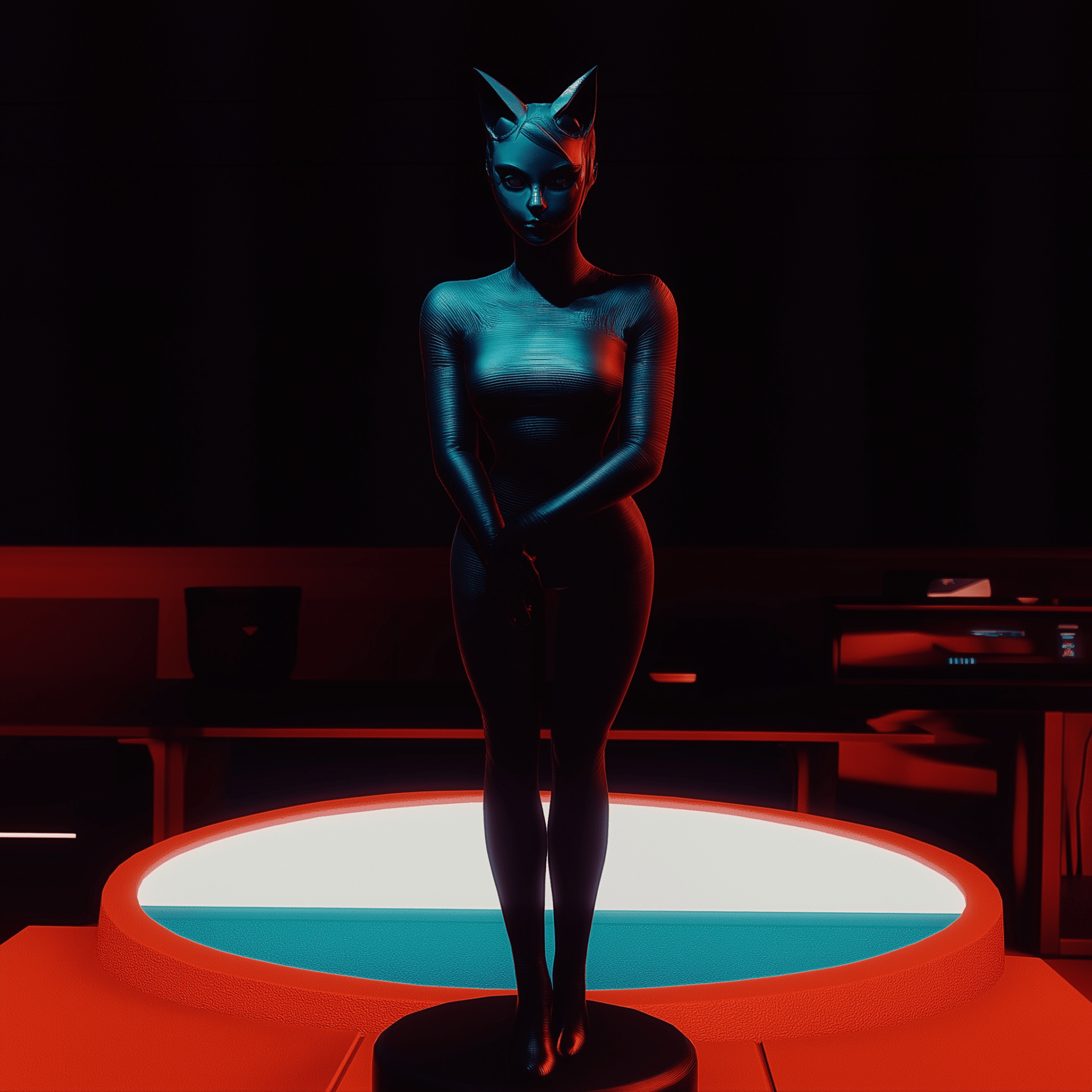 The image captures a gothic catgirl surrounded by burgundy textures and strange retro futuristic elements. The low light and dramatic cinematography create an atmospheric film noir vibe with deep blue and burnt orange hues.