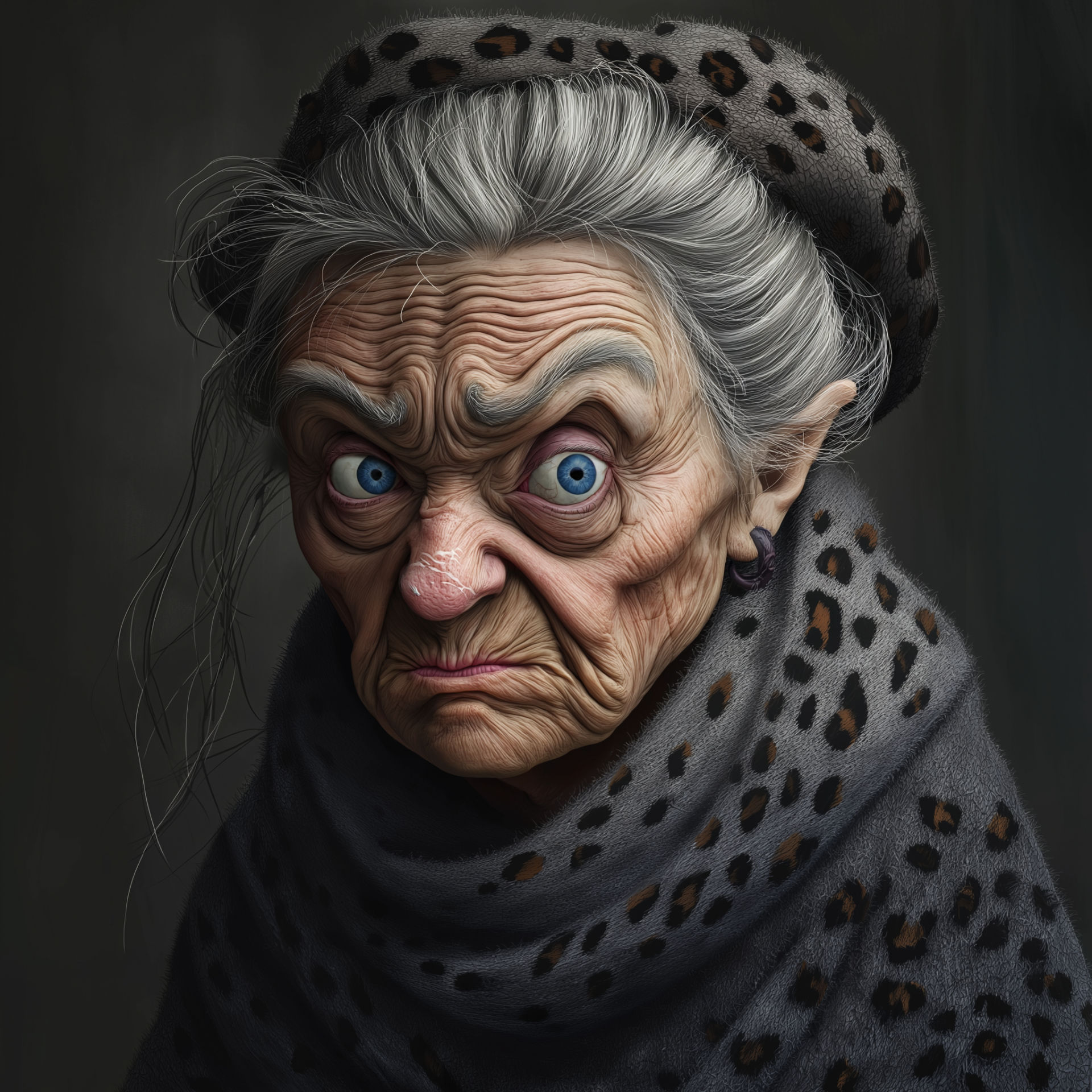 This illustration portrays a haunting figure with ugly blue eyes and an expression of sadness mixed with anger. The character is dressed in a grey woolen house coat adorned with a striking black leopard print, creating a stark contrast to her grotesque features.