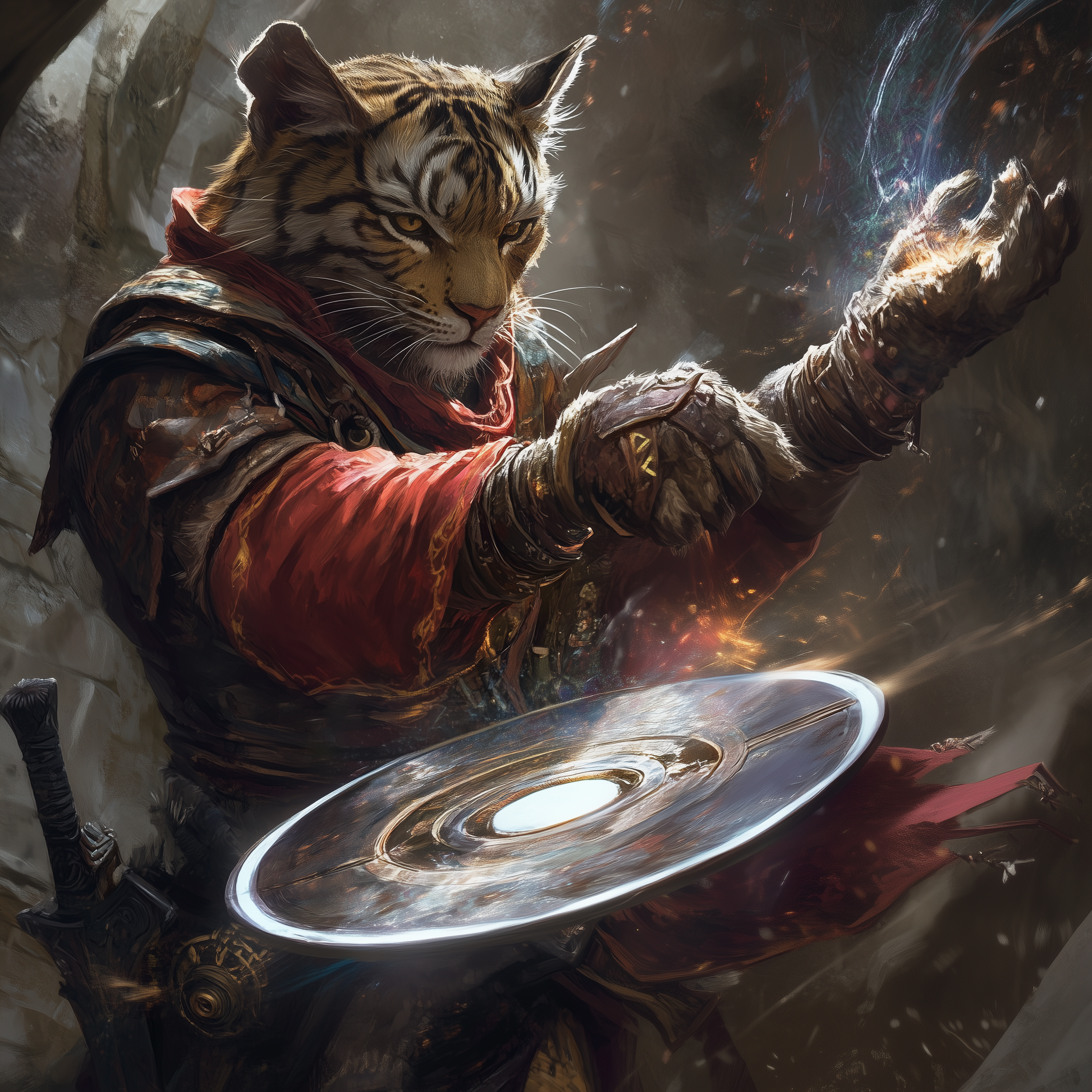 The image depicts a weretiger rogue in a dynamic pose, intricately casting a spell towards a gleaming metal disc blade. The atmosphere is charged with magic, showcasing vibrant spell effects and a sense of action.