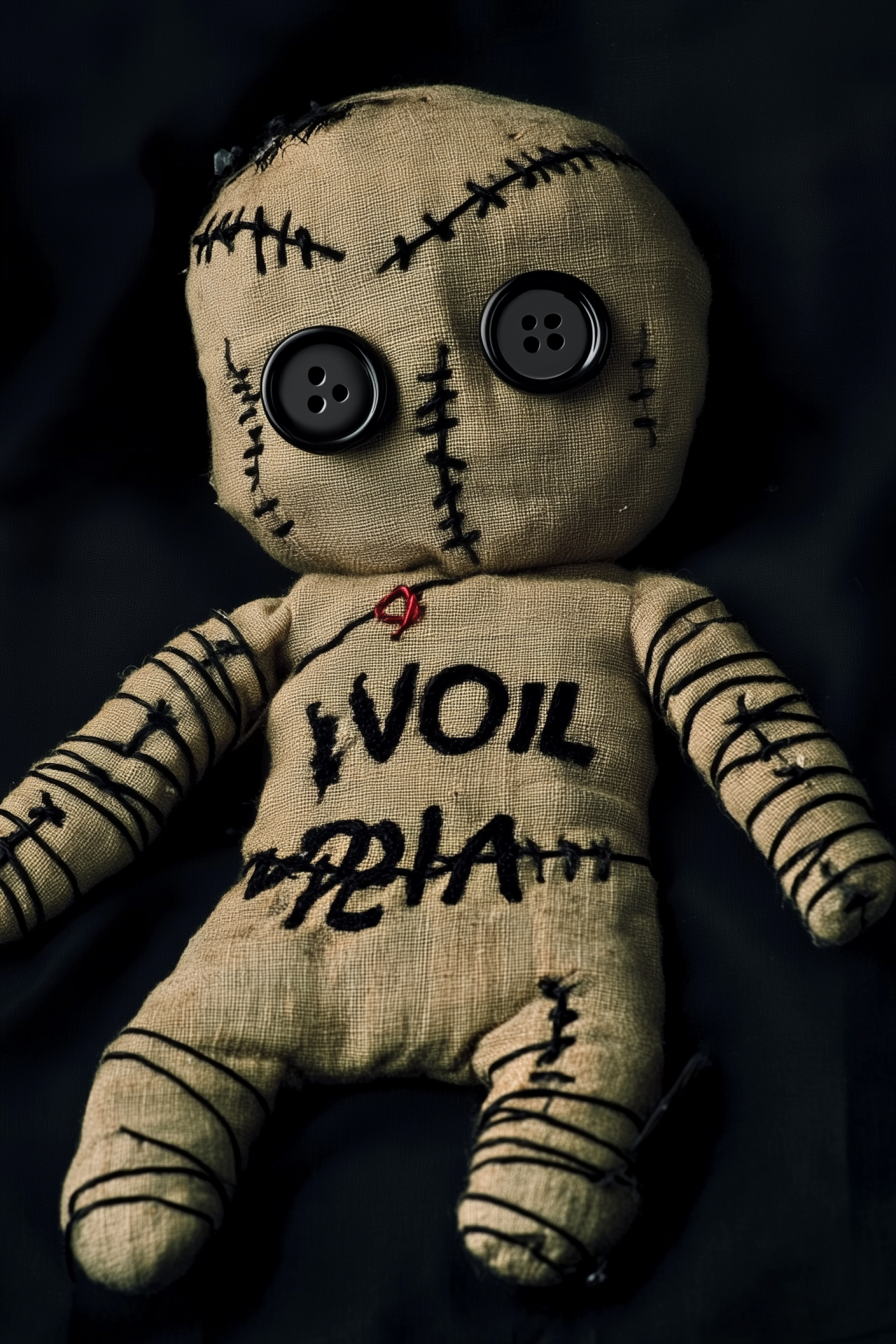The image features a voodoo doll adorned with old black buttons for eyes and intricate stitches. It is presented in a realistic comic book style, laying diagonally across the frame, exuding a mysterious and whimsical aura.