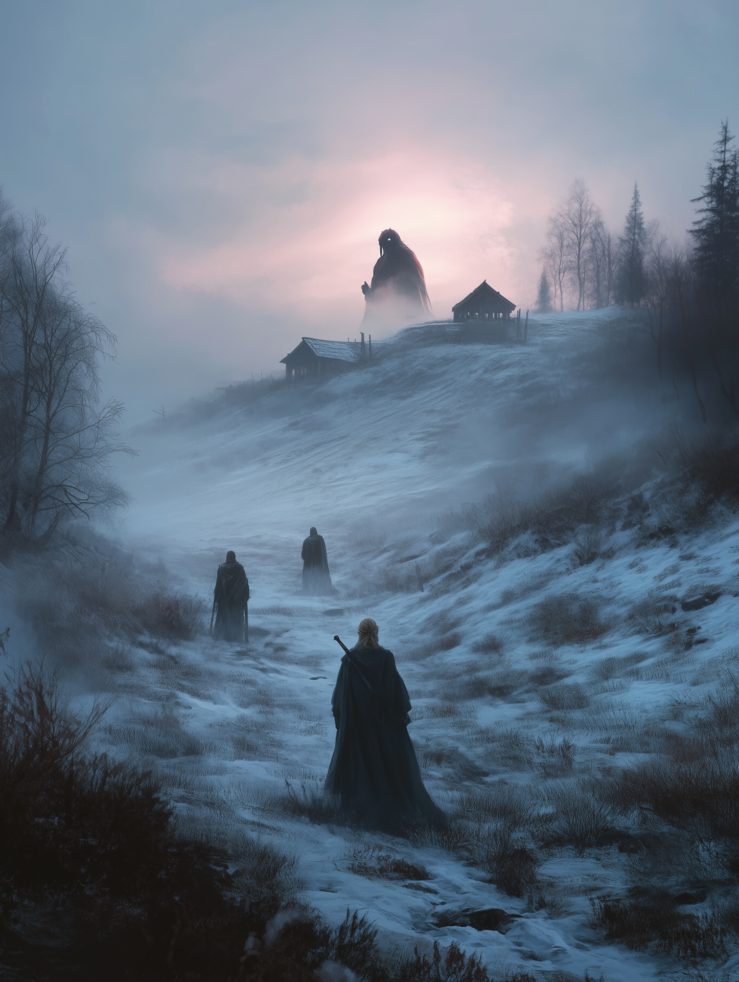 This image captures an epic and mystical landscape of ancient Slavic Russia at dawn, enveloped in snow and fog. The solemn frozen fields and twisted trees create a haunting atmosphere, where distant figures and shadowy forms evoke a sense of ancient prophecy.