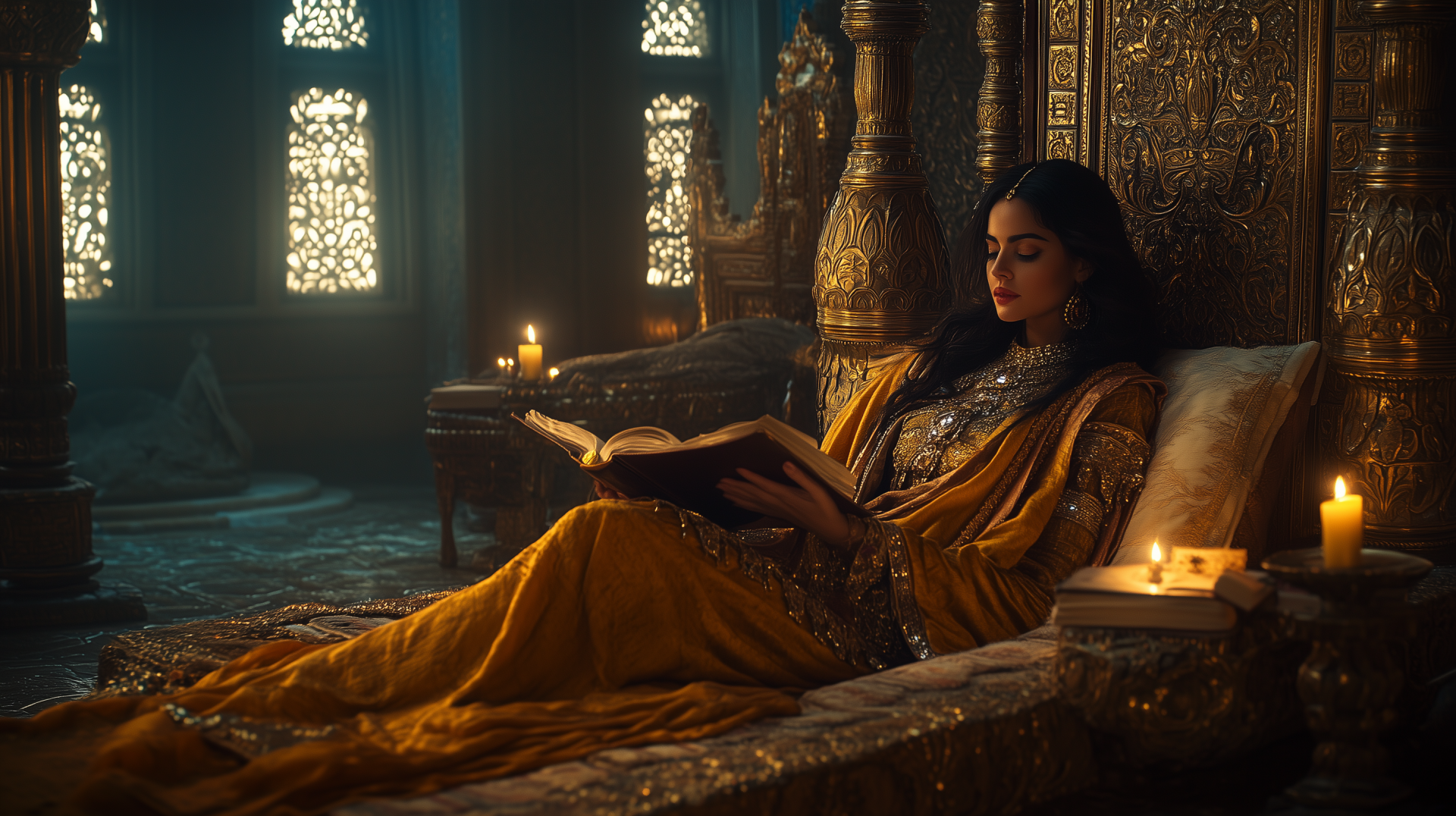 The image captures a mystical Arabian palace under the night sky, with flickering candlelight casting warm shadows. A storyteller in luxurious attire creates an enchanting atmosphere, drawing viewers into a world of tales and wonder.