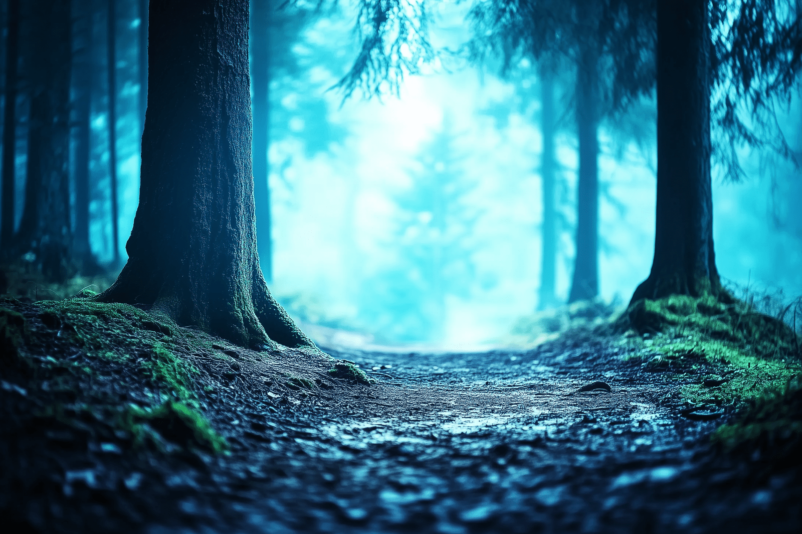 The image depicts a dense, misty forest that feels both enchanting and mysterious. Dappled sunlight filters through the trees, creating an atmospheric and sophisticated ambiance.