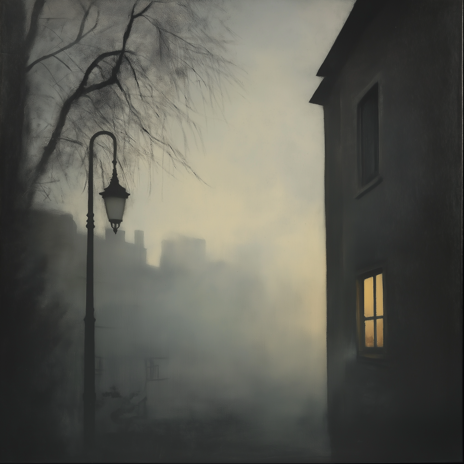 The image captures a serene, misty landscape that evokes a sense of calm and tranquility. Cloudy skies gently obscure the distant hills, creating a mysterious yet peaceful atmosphere.