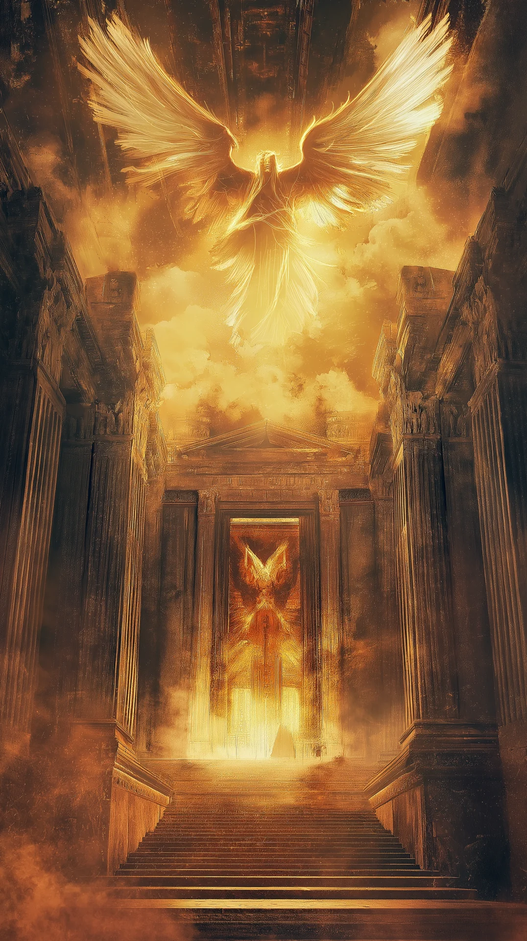 An aerial view captures the grandeur of an ancient temple intricately carved into a mountain's side. Stone pillars and illuminated hallways create a mystical atmosphere amidst a sheer cliff dropping into a sea of clouds.