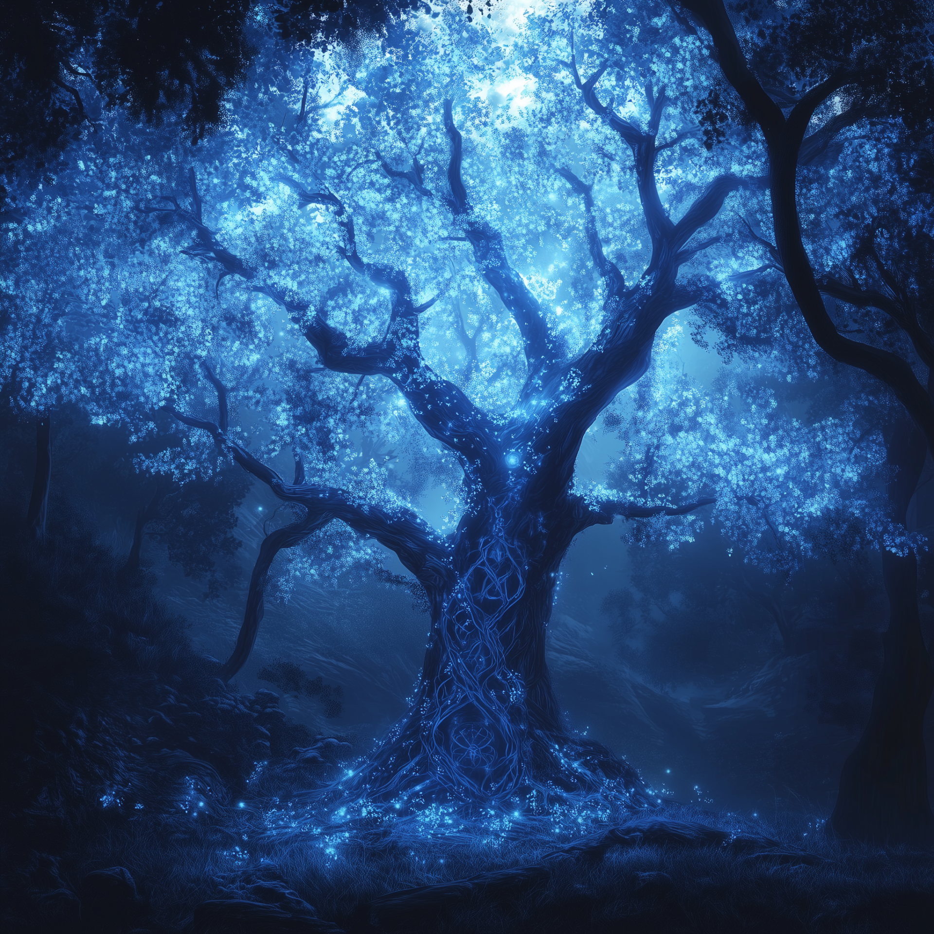 A magical tree of life stands prominently in a dense forest, bathed in shades of blue. Its branches glow softly, resembling intricate patterns, while a faint mist and starlight filter through the surrounding trees, creating a mysterious atmosphere.