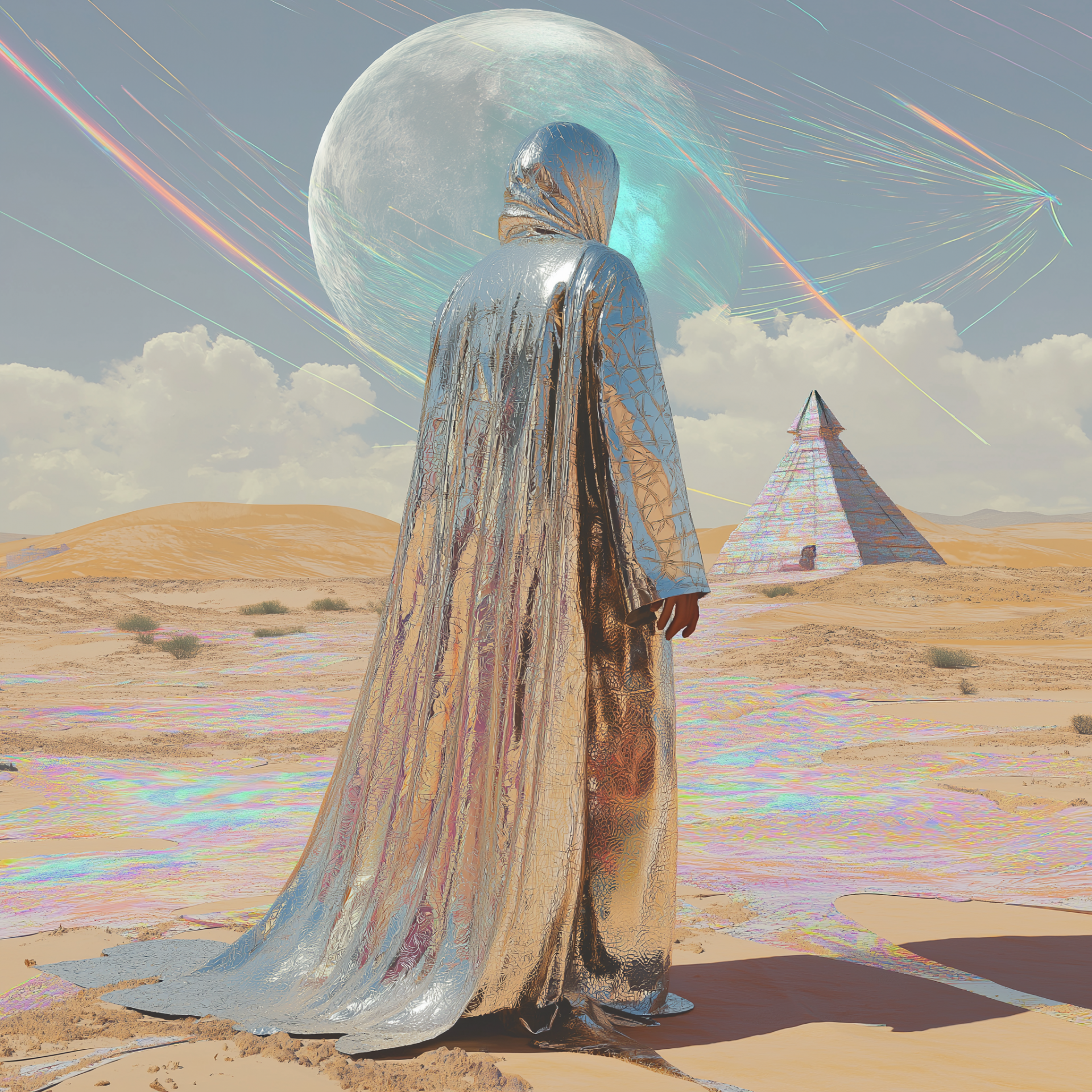 A Sufi mystic is gracefully adorned in a vibrant and flowing robe that gives off an aura of spirituality and elegance. The image captures a sense of tranquility and depth, showcasing a harmonious blend of traditional mysticism and contemporary fashion.