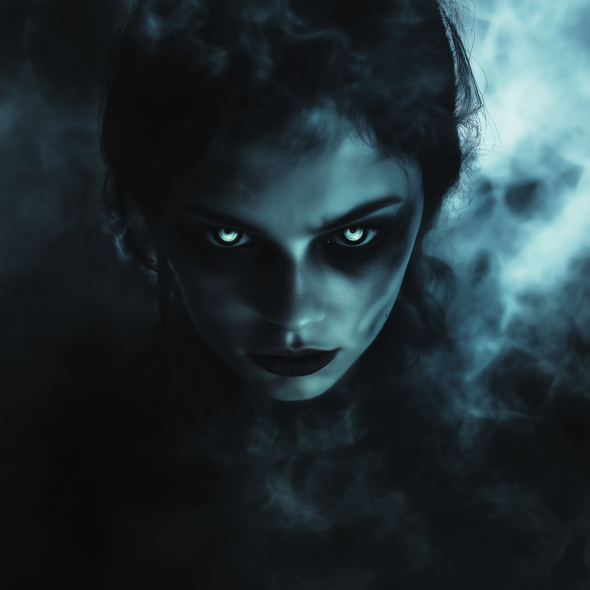 This 4k image portrays a woman with an intense, haunting stare, her eyes completely blackened. The artistic style emphasizes a dark and eerie atmosphere, creating a sense of mystery and intrigue.