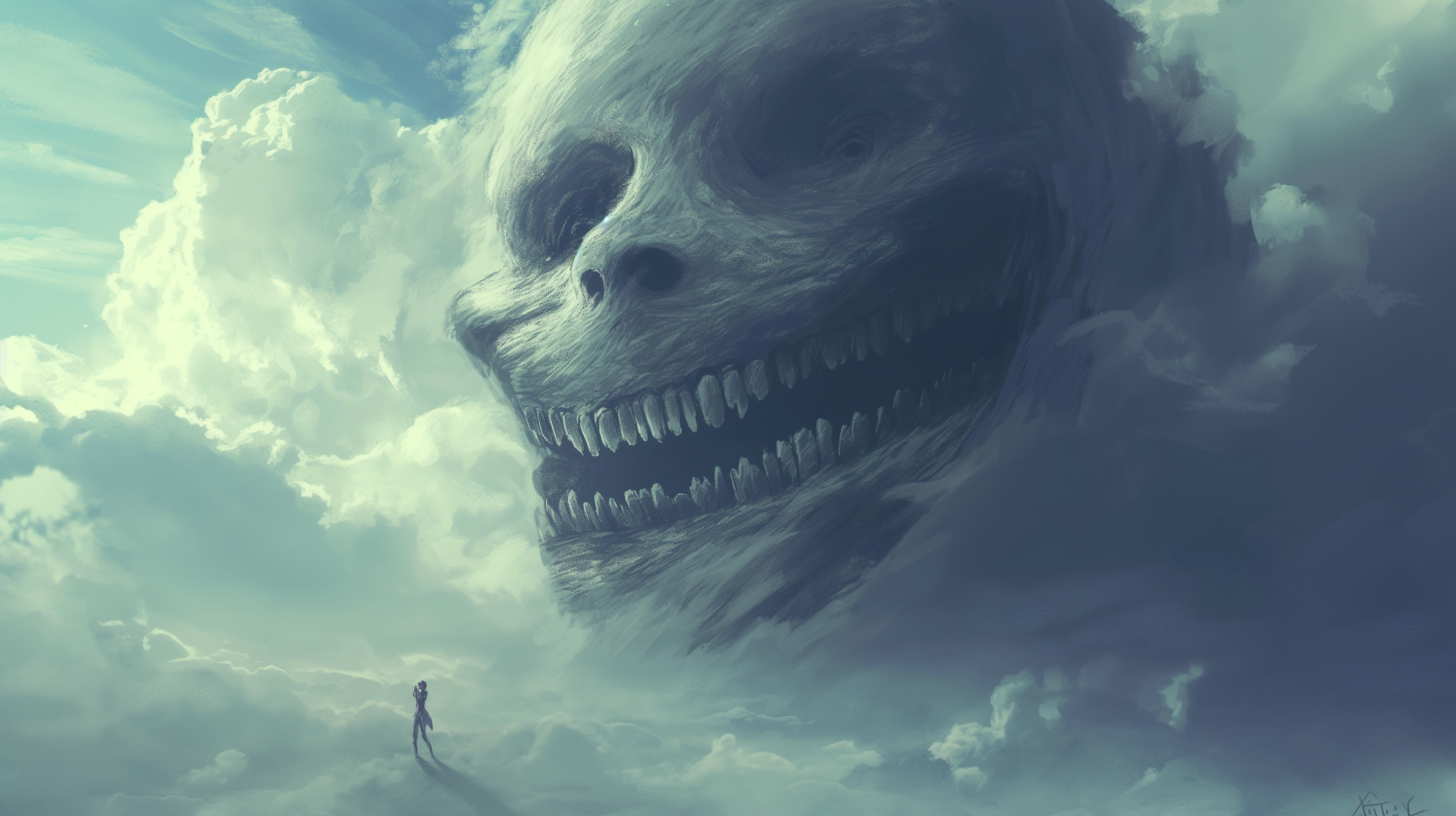 The image depicts a giant figure with an exaggerated wide smile looming against a dark sky. The horror art style adds an eerie yet captivating atmosphere, filled with unsettling shapes and shadows.