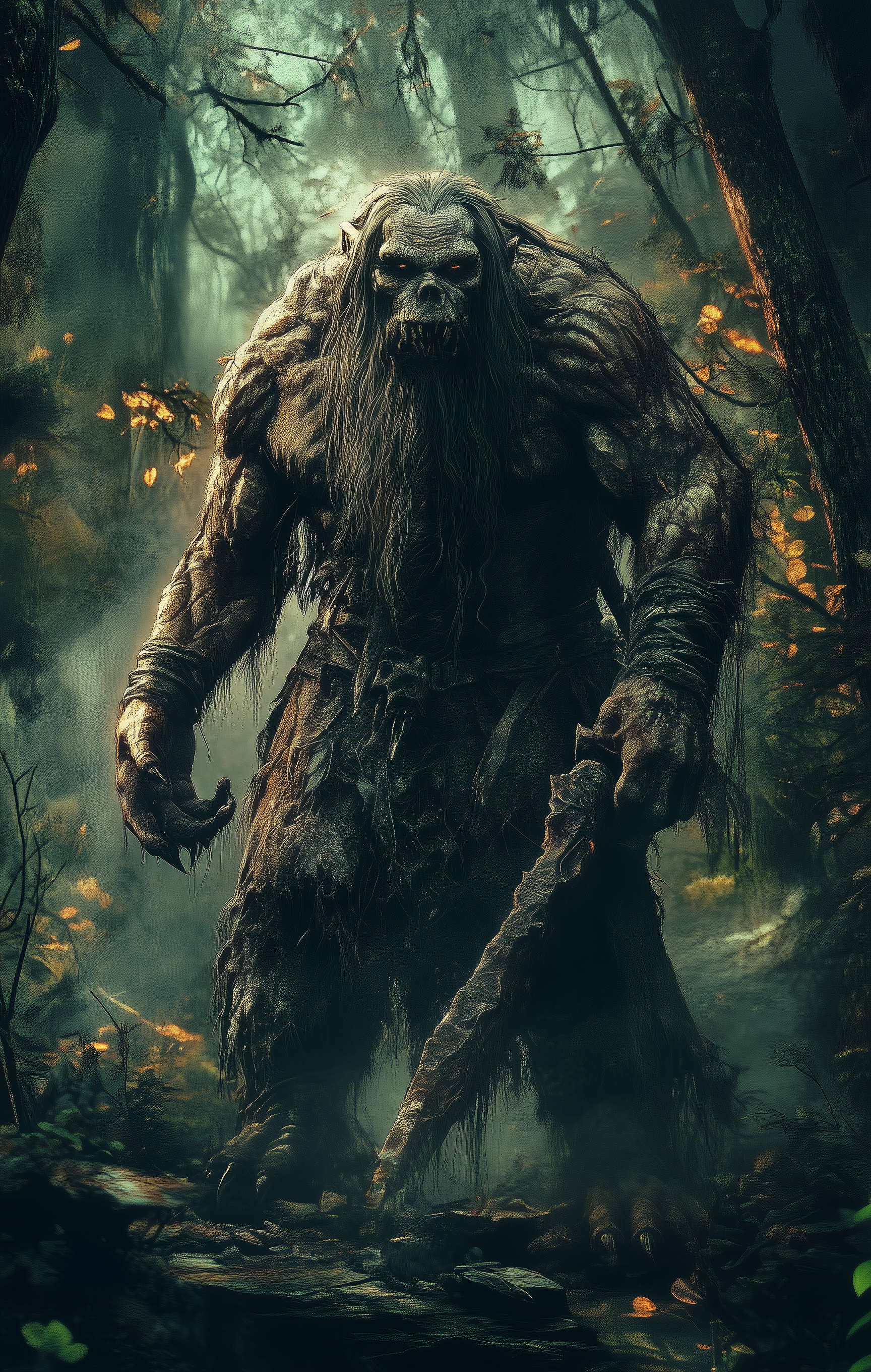 An eerie, mystical creature towering in a dark forest, blending fantasy elements with a hint of folklore and magic.