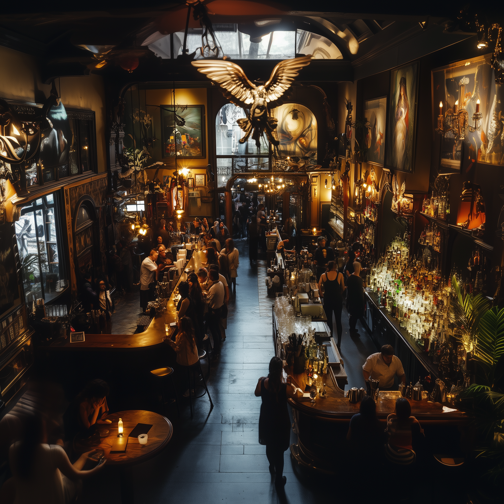 The image captures an antique bar pub during golden hour, filled with an eclectic mix of patrons. The atmosphere has a cinematic quality, showcasing a blend of gothic elements and intriguing characters enjoying cocktails.