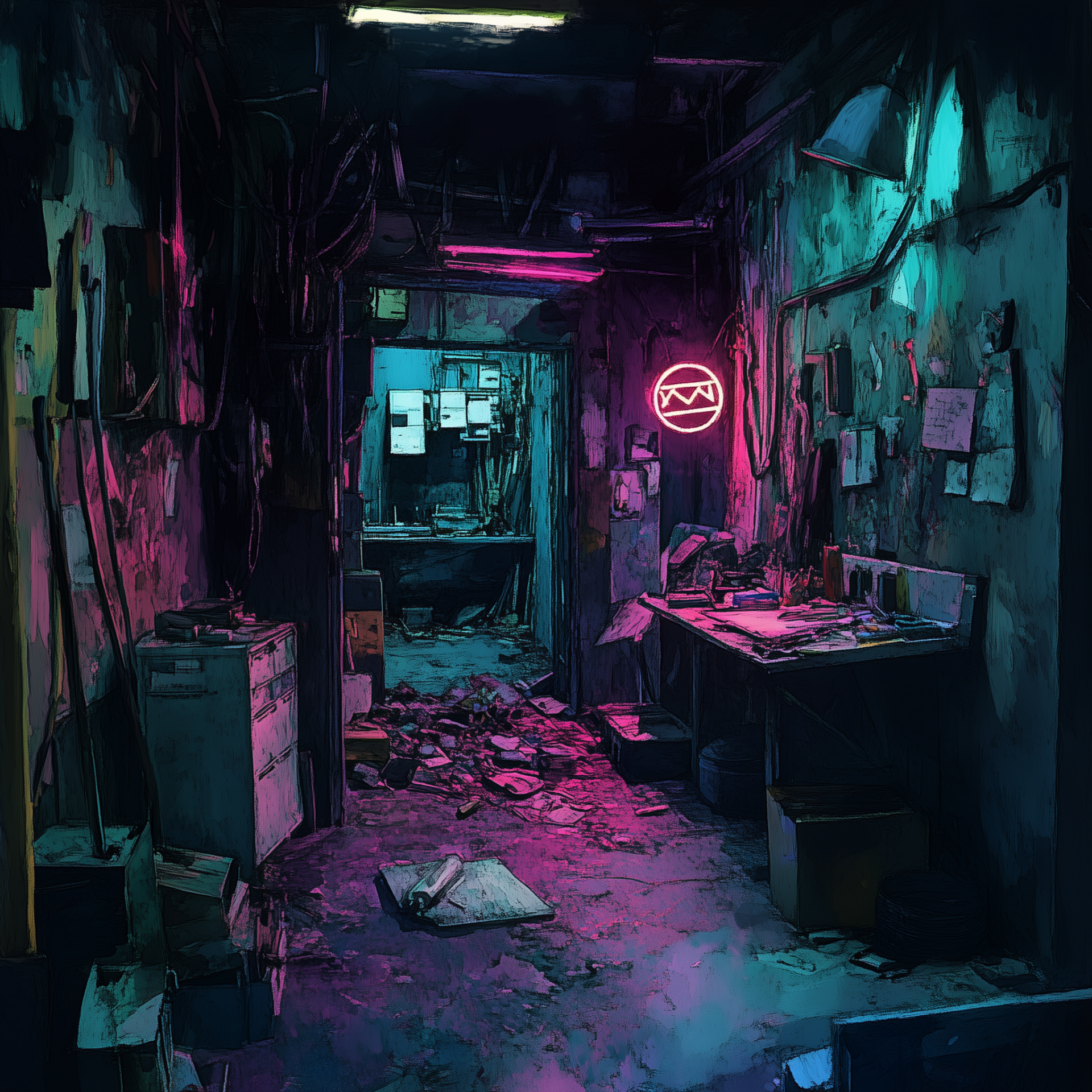 The image portrays a dimly lit room that exudes a mysterious ambiance, enhanced by neon glow lights. In the center, a scrap heap is surrounded by workbenches along the walls, creating an intriguing workspace view.