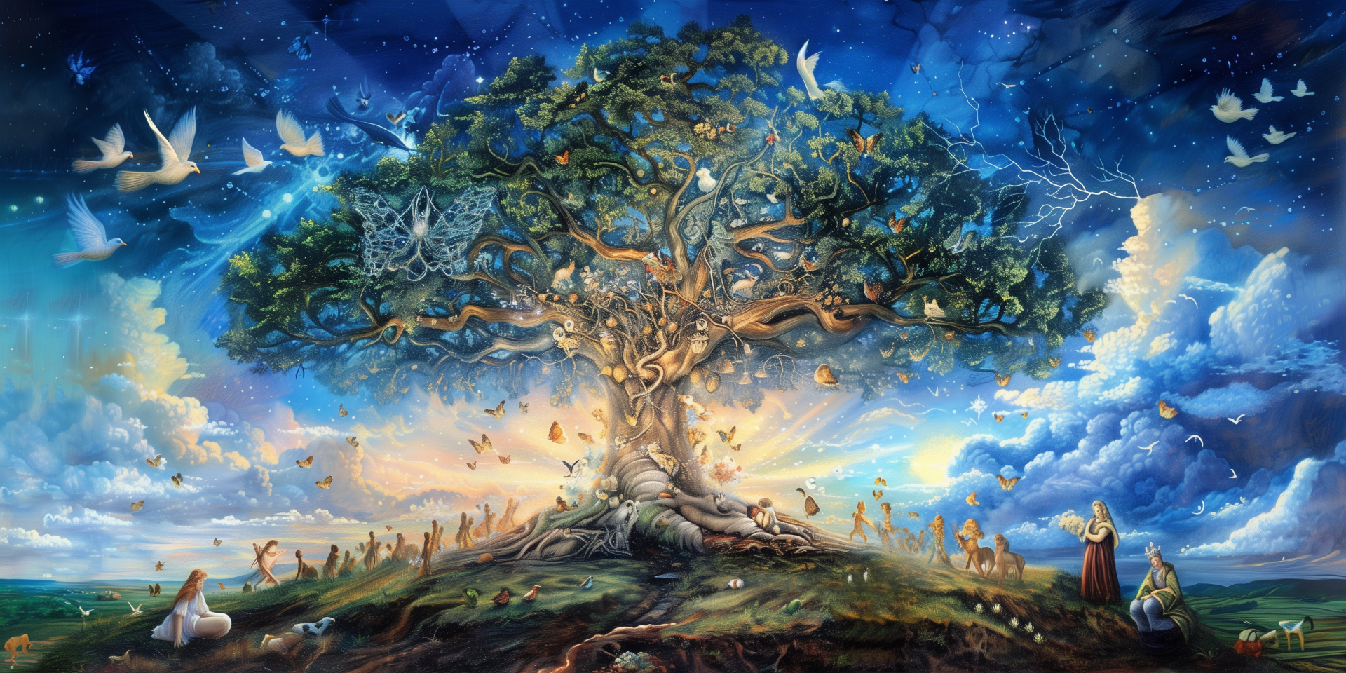 This vibrant illustration depicts the world tree Yggdrasil, serving as a mystical centerpiece. Surrounding it are whimsical characters like the Easter Bunny, Santa Claus, fairies, Jesus, and Cupid, creating a magical and festive atmosphere.