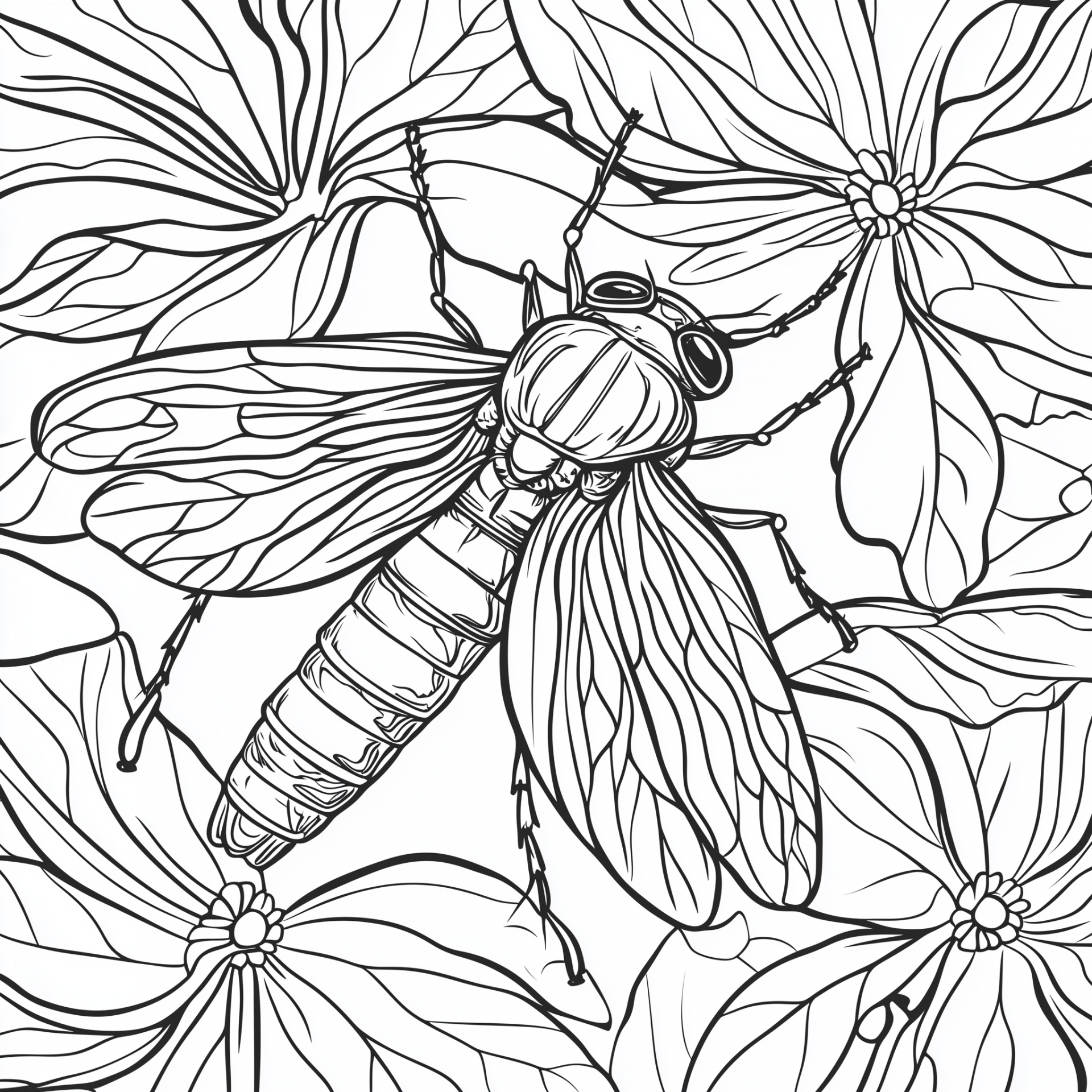 This image features a coloring book page showcasing a firefly amidst elements of nature. The bold black outlines and solid white background create a striking vector style, perfect for coloring.