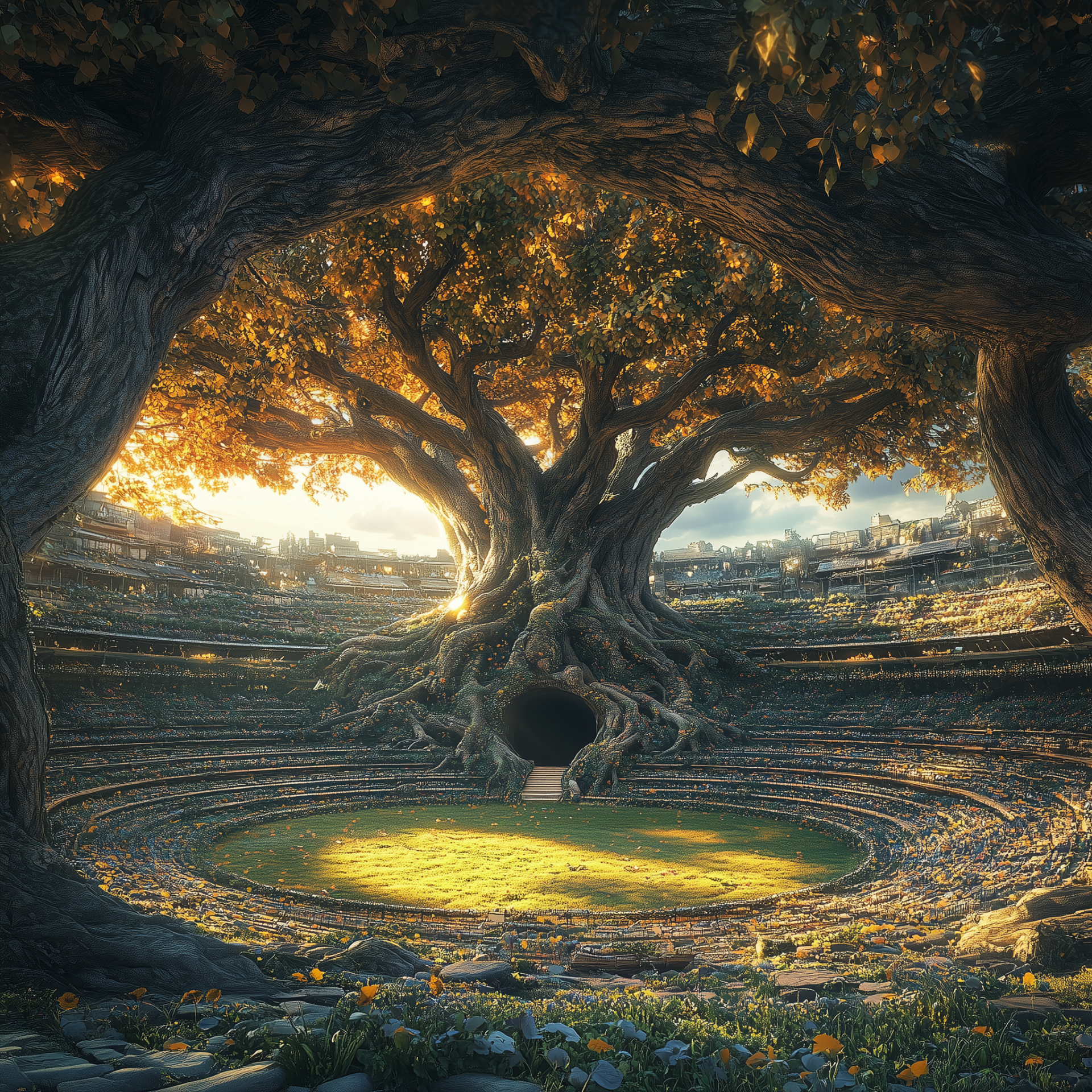 This imaginative illustration showcases a unique stadium crafted entirely from a towering tree, with its roots forming an oval shape. Foliage and vibrant flowers create a magical atmosphere, adding a touch of realism to this enchanting space.