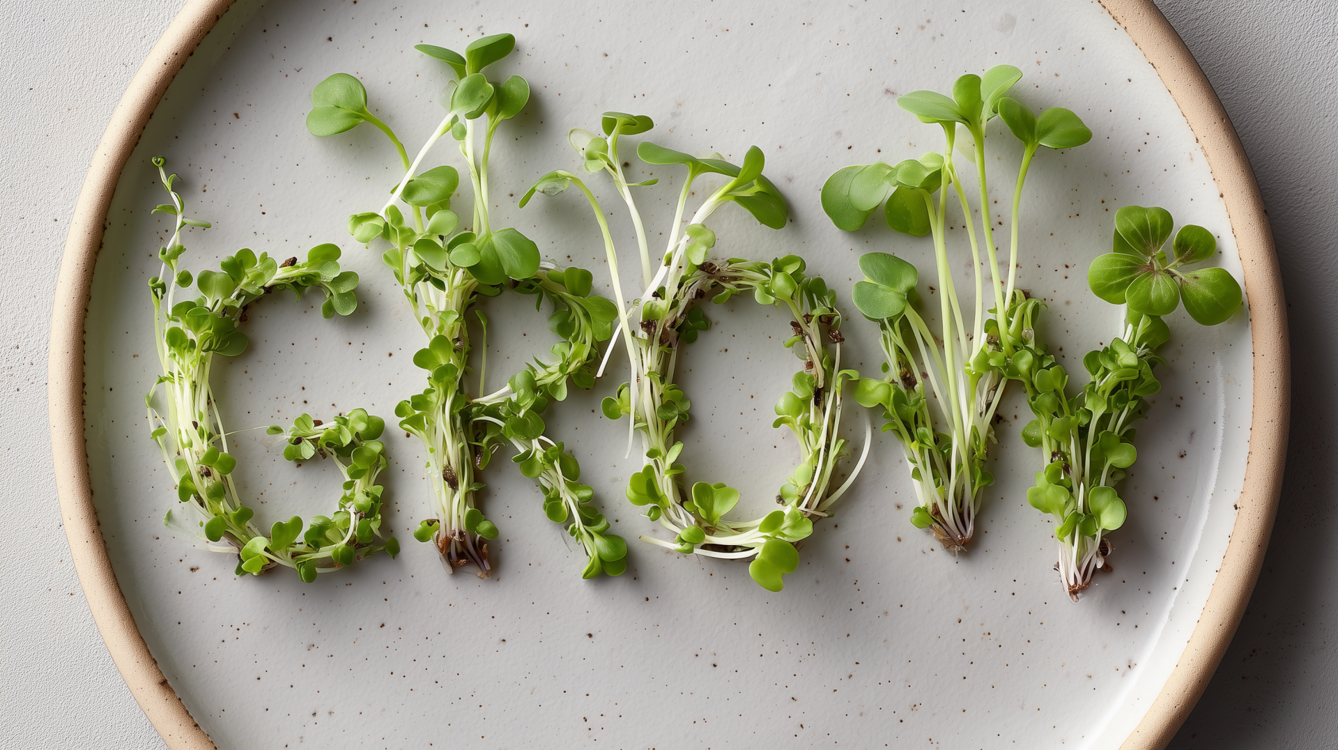 The image features an artistic arrangement of sprouts shaped into the word 'GROW' on a simple white plate. The vibrant greens of the sprouts create a fresh and healthy aesthetic, promoting a positive message about wellness.