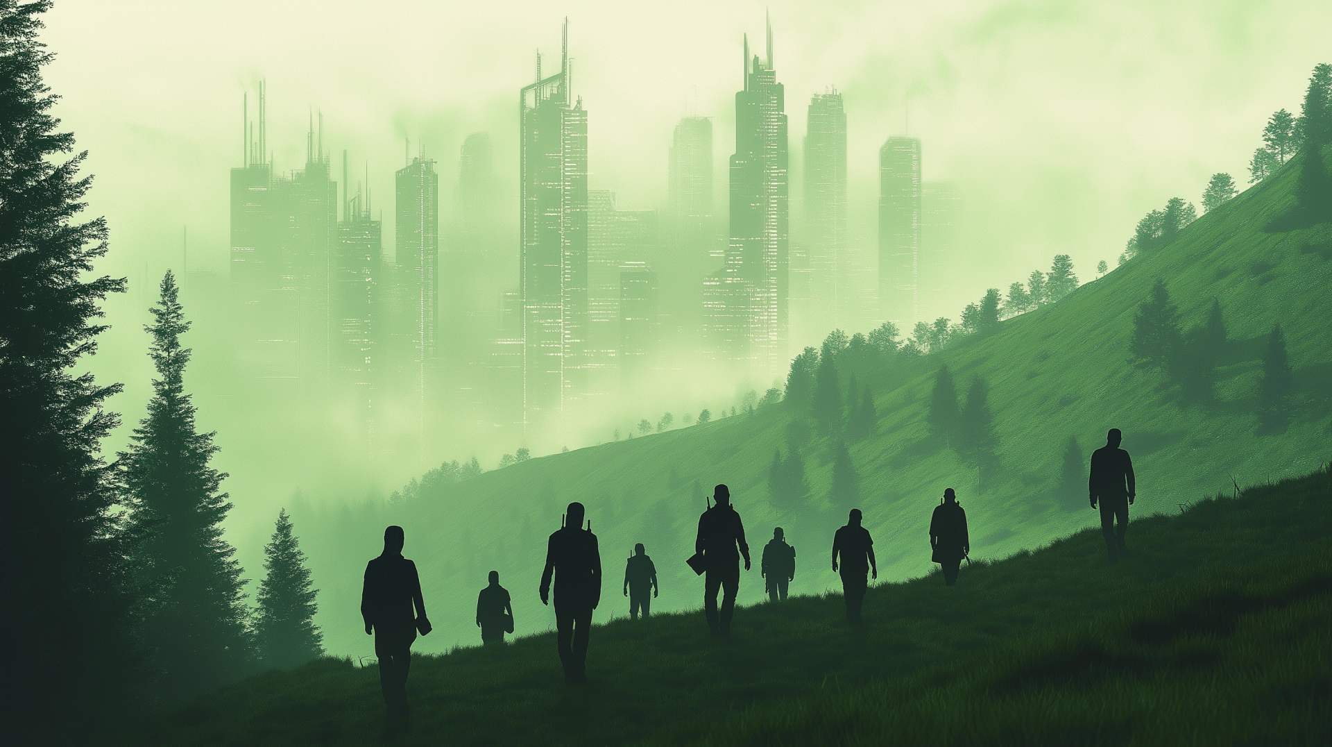 The image features a group of silhouetted figures walking into a wide green valley. Surrounded by glowing trees and misty hills, the scene captures a surreal pastel cyberpunk style, evoking a cinematic escape to nature.