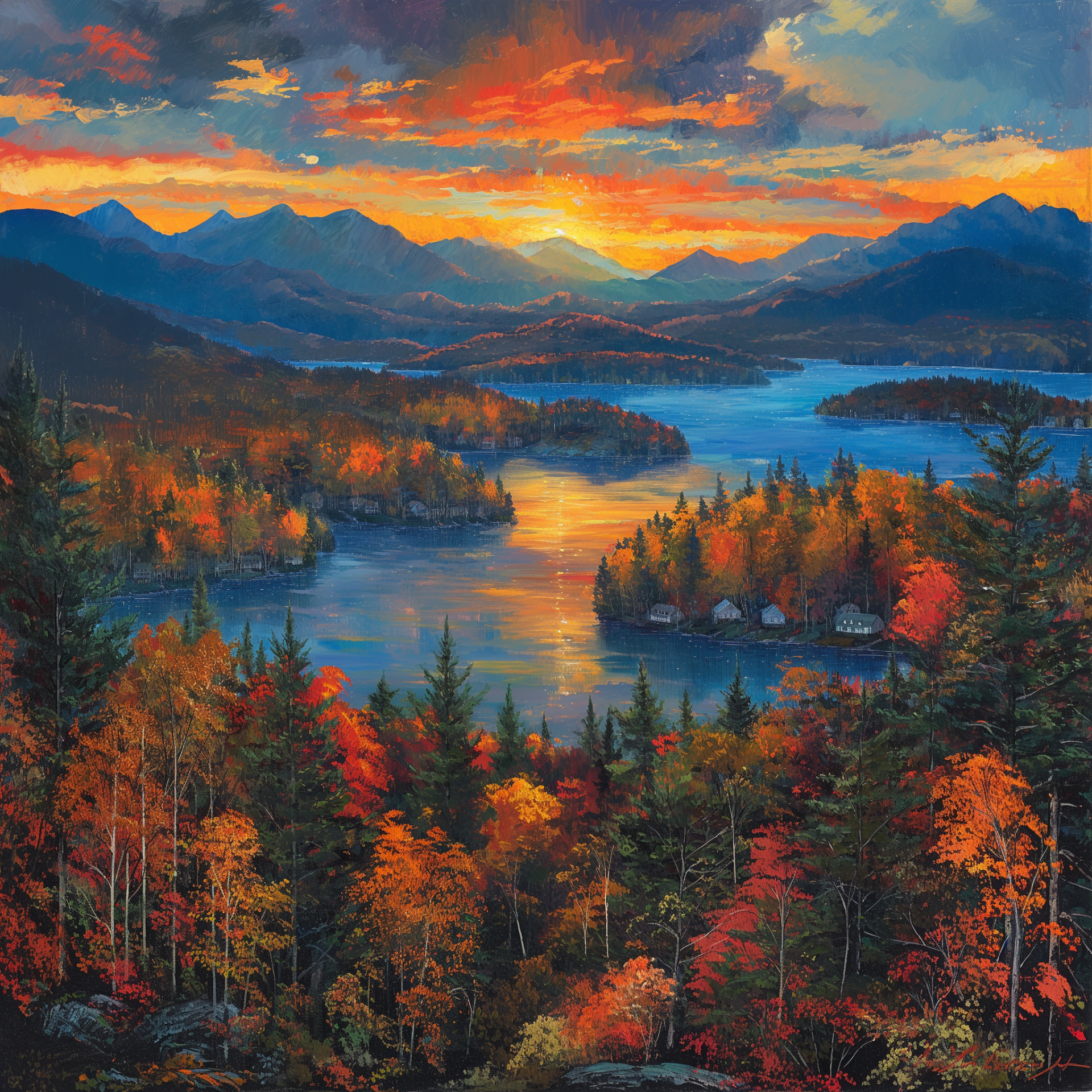 This painting showcases the breathtaking views of the Adirondack Mountains during the vibrant autumn season. The colorful foliage contrasts beautifully with a dramatic sunset sky, creating a serene natural landscape.