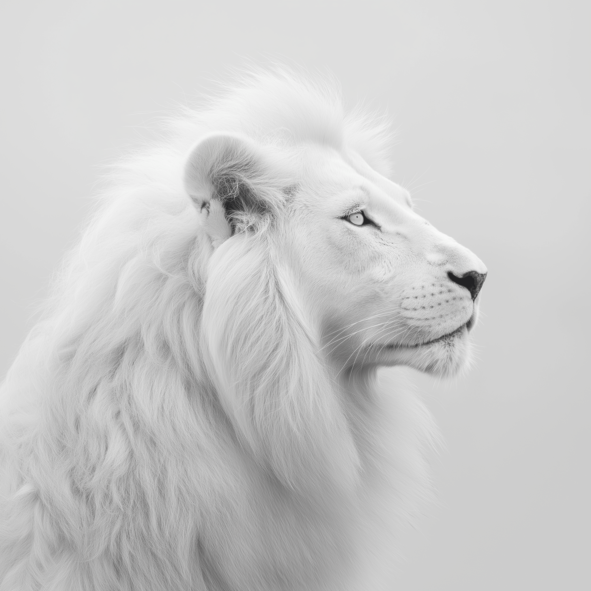 The image showcases a majestic albino lion with pale fur and striking blue eyes. Its regal presence exudes a sense of calm strength in a natural setting.